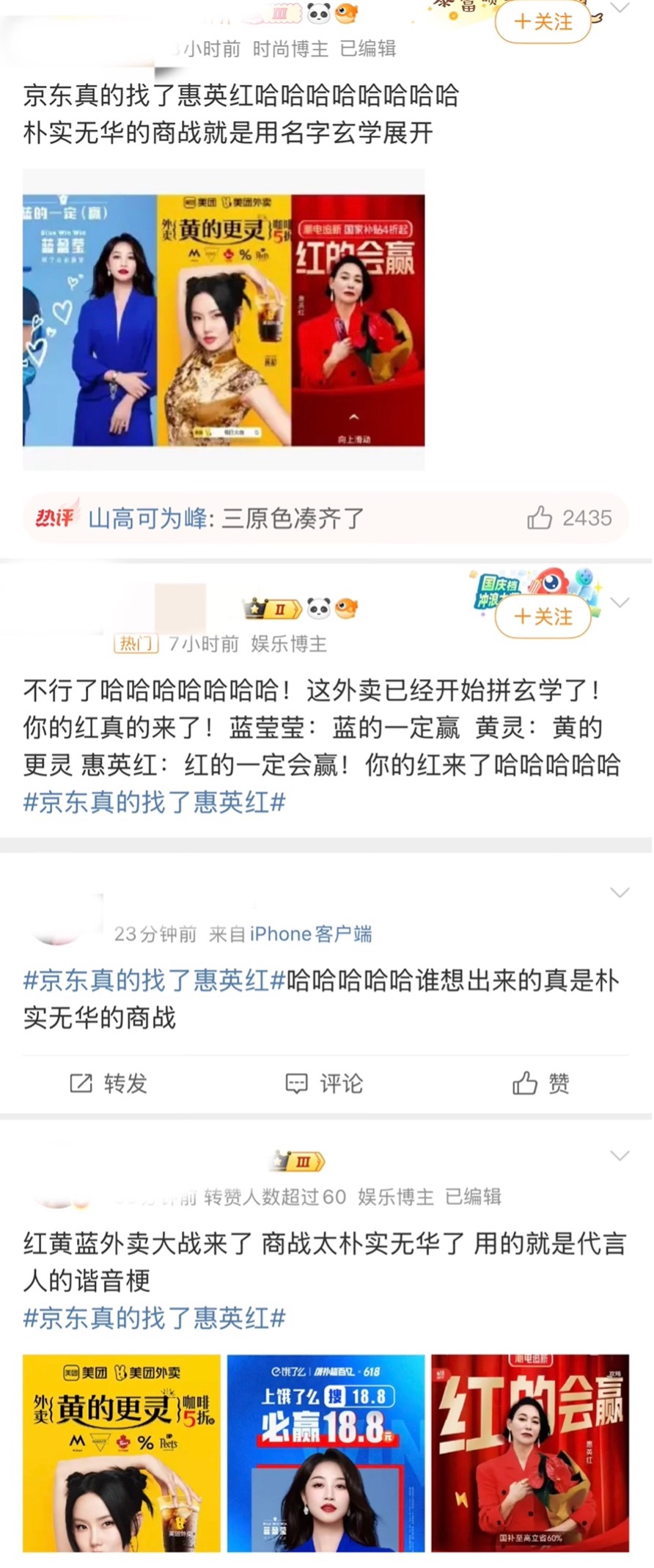 继外卖补贴大战后,近期巨头们又在网络上掀起一波营销大战。 6月11日,“京东真的找了惠英红”登上微博热搜。同日打开京东APP,能看到惠英红一身红装的开屏广告。 至此三家外卖巨头的营销商战达到高潮,网 ...