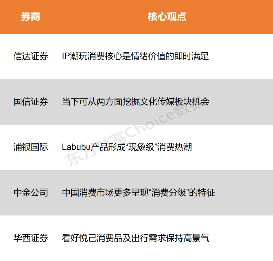 6月12日,沪指盘中窄幅震荡,创业板指小幅走高,场内超2800股飘绿,全A成交额有所放大。 行业板块涨多跌少,贵金属、美容护理、珠宝首饰、多元金融、文化传媒、家用轻工、生物制品板块涨幅居前,航运港口、酿酒行业、电子化学品板块跌幅居前。 随着LABUBU的强势出圈,泡泡玛特一跃成为全球现象级焦点。从东南亚到欧美,粉丝排队购买,掀起“一娃难求”的抢购狂潮。6月12日,港股泡泡玛特一度涨超5%,续创历史新高。信达证券表示,当前IP潮玩消费核心是情绪价值的即时满足,当前其供给侧的短缺及部分稀缺性进一步加大产品流通溢价;浦银国际指出,Labubu 3.0系列再次引爆潮玩市场,影响力持续扩大,形成“现象级”消费热潮;中金公司认为,中国消费市场更多呈现“消费分级”的特征,消费者更愿为“有品质的低价”和“有理由的溢价”买单。 ![]() 信达证券:IP潮玩消费核心是情绪价值的即时满足 当前IP潮玩消费核心是情绪价值的即时满足,Labubu以其个性特点满足部分需求,结合社媒快速放大,当前其供给侧的短缺及部分稀缺性进一步加大产品流通溢价,从而显著扩大其关注度。 国信证券:当下可从两方面挖掘文化传媒板块机会 当下可从两方面挖掘文化传媒板块机会。一是基本面处于底部且有望改善的板块,关注游戏、广告媒体、影视等板块,寻找个股α。二是高景气的IP潮玩以及从0到1阶段的AI应用。IP潮玩高景气持续、受众及品类持续泛化;AI应用处于加速落地的阶段,重点把握应用场景机会,关注游戏、玩具、广告、教育、电商、社交等方向。 浦银国际:Labubu产品形成“现象级”消费热潮 2025年4月推出的Labubu 3.0系列再次引爆潮玩市场,成为全球最热门的潮玩IP之一。该IP在社交媒体和搜索平台上的热度远超其他经典IP,限量销售策略进一步加剧了市场追捧。社会名流如贝克汉姆在社交平台上展示Labubu产品,推动其影响力持续扩大,形成“现象级”消费热潮。 中金公司:中国消费市场更多呈现“消费分级”的特征 当前,尽管总体消费仍显不足,但新消费不乏热点。中国消费市场更多呈现“消费分级”的特征,并非简单的“消费降级”,消费者更愿为“有品质的低价”和“有理由的溢价”买单。我国也正处在从大众消费向个性与理性消费转换的阶段。从结构看,Z世代的消费意愿、消费能力以及注重情价比和质价比的消费特征,均驱动了新消费的浪潮,而低能级城市受房地产的拖累也正在减弱,助力消费潜力释放。 华西证券:看好悦己消费品及出行需求保持高景气 2025全年,看好悦己消费品(潮玩、时尚黄金等)及出行需求保持高景气,同时关税事件背景下,出海服务商有望受益。建议关注:1、消费者为情绪价值买单意愿增强,高景气新零售赛道有望持续获得超预期表现;2、促内需背景下,顺周期板块有望低位复苏,从而释放业绩弹性;3、消费出海前景广阔,近年来政策不断加大对国货品牌出海的支持力度,建议关注出海服务商以及产品力较强的消费出海。 (本文不构成任何投资建议,投资者据此操作,一切后果自负。市场有风险,投资需谨慎。) (文章来源:东方财富研究中心) |