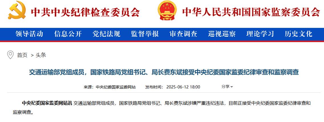 交通运输部党组成员,国家铁路局党组书记、局长费东斌涉嫌严重违纪违法,目前正接受中央纪委国家监委纪律审查和监察调查。