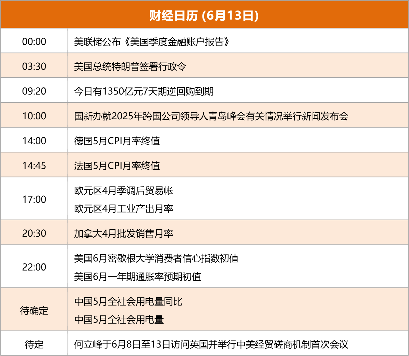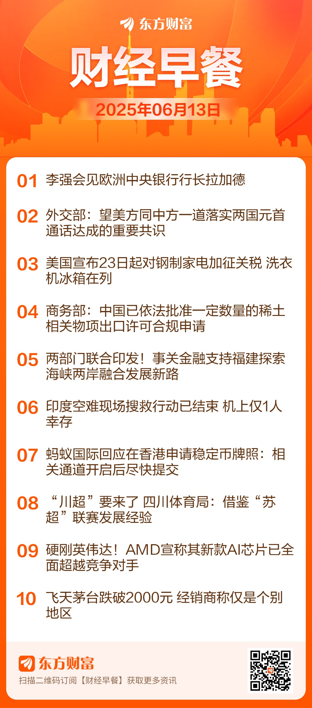 ![]() 每日精选中欧关系: 国务院总理李强6月12日下午在北京人民大会堂会见欧洲中央银行行长拉加德。李强表示,中方愿同欧方一道继续努力,巩固政治互信,扩大务实合作,共促发展繁荣,既成就彼此,也惠及世界。拉加德表示,欧央行很高兴同中方建立央行行长会晤机制并举行首次会议,致力于同中方金融机构加强沟通协调,拓展深化合作领域,共同应对全球性挑战,为世界注入更多稳定性和确定性。 中美经贸磋商: 外交部发言人回应中美经贸磋商机制会议有关问题时表示,中方一向言必行、行必果。既然达成了共识,双方都应遵守,希望美方同中方一道落实两国元首通话达成的重要共识,发挥中美经贸磋商机制作用,通过沟通对话增进共识、减少误解、加强合作。 美国对钢制家电加征关税: 央视记者当地时间6月12日获悉,美国商务部宣布将自6月23日起对多种钢制家用电器加征关税,包括洗碗机、洗衣机和冰箱等“钢铁衍生产品”。据悉,对大多数国家设定50%的关税将影响这些钢铁制品的进口,可能导致消费价格上涨,行业利益相关者正在密切关注事态发展。 美国“对等关税”: 美国财政部长贝森特表示,特朗普政府愿意将目前对美国主要贸易伙伴实施的90天关税暂缓期延长至7月9日以后,只要他们在正在进行的贸易谈判中表现出“诚意”。同时,美国总统特朗普也表示,愿意延长贸易谈判的截止期限,但认为这并非必须要做。 美国PPI: 美国5月PPI同比增长2.6%,预期2.6%。美国5月PPI环比增长0.1%,预期0.2%。 稀土出口: 商务部发言人回应有关稀土问题时表示,中国作为负责任大国,充分考虑各国在民营领域的合理需求与关切,依法依规对稀土相关物项出口许可申请进行审查,已经依法批准一定数量的合规申请,并将持续加强合规申请的审批工作。 两岸融合发展: 近日,中国人民银行、国家外汇局联合印发《关于金融支持福建探索海峡两岸融合发展新路建设两岸融合发展示范区的若干措施》。《若干措施》着眼两岸融合发展示范区建设,支持福建探索海峡两岸融合发展新路,助力两岸交流交往交融。 印度空难: 北京时间13日凌晨,印度民航部宣布,本次事故的现场搜救行动已经结束。印度警方公布的最新数据显示,本次事故造成至少265人死亡。当地时间12日,印度内政部长阿米特·沙阿确认仅有一名机上乘客在这起事故中幸存,有关部门正在采集机上人员亲属的DNA样本,死者名单将在DNA检测结束后公布。 热点题材入境旅游: 国家移民管理局发布公告,自2025年6月12日起,印度尼西亚公民可适用240小时过境免签政策便捷来华,中国240小时过境免签政策适用国家增至55国。 稳定币: 针对有报道称蚂蚁国际正计划在香港和新加坡申请稳定币牌照一事,蚂蚁国际回应称,正在全球财资管理方面加速投资、拓展合作,将我们的AI、区块链和稳定币创新投入真实可靠的大规模应用。“我们欢迎香港立法会通过《稳定币条例草案》,将于法案8月1日生效、相关通道开启后尽快提交申请,希望为香港建设未来国际金融中心贡献更多力量。”蚂蚁国际表示。 金融稳定委员会(FSB)主席克拉斯·科诺特发声警告,强调加密资产带来的风险可能很快会对金融体系构成严重威胁。他在第5届金融稳定会议的开幕致辞中表示:“金融稳定委员会长期以来一直认为加密资产尚未构成系统性风险,但近期事态表明我们可能正接近临界点。”他特别指出,稳定币发行机构目前持有大量美国国债,这是必须密切监控的领域。 “川超”: 随着“苏超”的火爆出圈,有网友通过问政四川平台留言呼吁四川举办类似的足球赛事。对此,四川省体育局答复称,“巴蜀雄起杯”川超联赛将借鉴“苏超”联赛的健康发展经验,完善赛事体系,强化监管,推动公平竞赛,并动员社会力量参与,促进群众足球与校园足球发展,助力全民健身。 谷子经济: 泡泡玛特旗下顶流IP——LABUBU怪味便利店系列即将在成都举办主题快闪活动。但由于其超高人气,预约票秒空后,已经有黄牛炒至500元,而原价仅为0.01元,预约资格瞬间变得一票难求。 低空经济: 深圳市委副书记、市长覃伟中表示,接下来,深圳将围绕建设国家新一代人工智能创新发展试验区、国家低空经济产业综合示范区,汇聚最优资源、集聚最大力量,推动人工智能、低空经济产业发展加力提速,成群成势。 广汽集团宣布,其首款量产飞行汽车高域AirCab在香港全球首发,并正式开启预订,官方指导价不超过168万元。 AI芯片: 当地时间周四(6月12日),超威半导体公司(AMD)首席执行官苏姿丰(Lisa Su)表示,MI350系列芯片的最新版本在速度上已优于英伟达的同类产品,较其前代产品也实现了巨大得性能提升。 房地产: 广西壮族自治区人民政府办公厅印发《广西提振消费专项行动实施方案》,其中提出,推进灵活就业人员参加住房公积金制度。统筹盘活各类房源,拓宽收购房源用途,用好专项债券、保障性住房再贷款等政策工具,2025年力争收购存量商品房2.5万套。 近日,上海市闵行区的区属国企宣布以公开收购方式筹集存量商品房用作保障性租赁住房,意味着上海在收购库存商品房方面也开始发力。截至目前,四个一线城市中,已有深圳、广州、上海三座城市先后宣布收购存量商品房。 具身智能: 继全球首届人形机器人半程马拉松赛事之后,北京亦庄宣布,全球首个具身智能机器人4S店将于2025世界机器人大会期间正