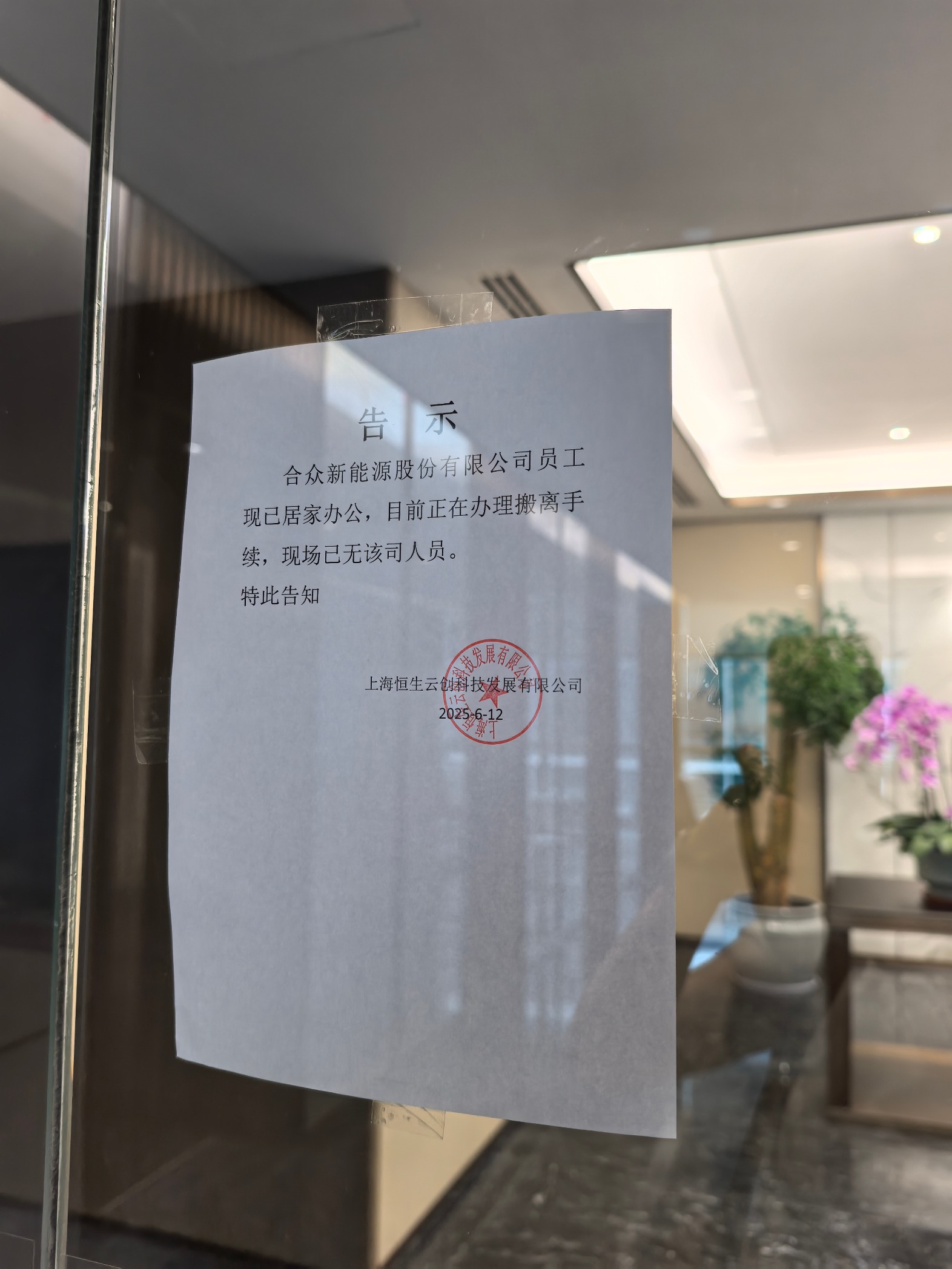 “合众新能源股份有限公司员工现已居家办公,目前正在办理搬离手续,现场已无该司人员。”6月12日,《每日经济新闻》记者在哪吒汽车位于上海市闵行虹桥商务区的新办公室大门上看到上述告示内容,落款方为上海恒 ...
