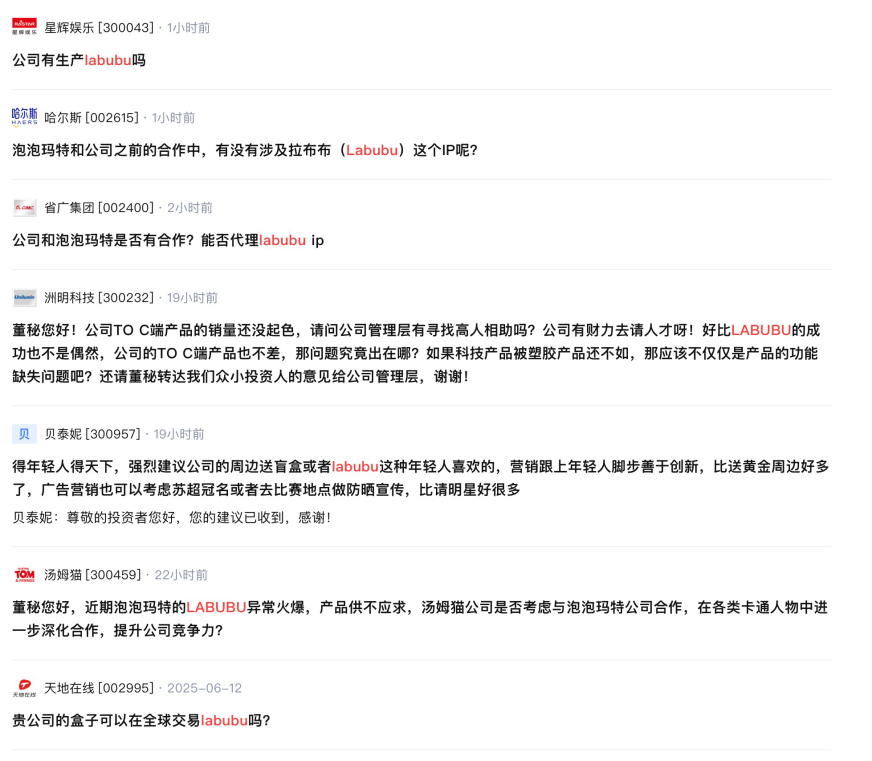 一只长着尖牙的毛茸茸小怪兽,正以惊人的速度席卷全球潮玩市场,泡泡玛特旗下IP Labubu晋升为“顶流”。 在泡泡玛特的带动下,“潮玩风”火到了A股市场。近期,盲盒经济、谷子经济等概念股领涨。继6月12日超10只概念股涨停后,6月13日截至午市收盘,厦门信达、哈尔斯继续涨停。 与此同时,多名投资者涌向投资者互动平台,追问上市公司是否与泡泡玛特存在合作,能否代理IP等相关问题。 上市公司纷纷回应 据记者不完全统计,截至6月13日中午,投资者互动平台上,已有星辉娱乐、奥飞娱乐、天地在线、省广集团等20余家上市公司被问到Labubu相关的内容。 ![]() 6月12日,易点天下在互动易平台回答投资者提问称,泡泡玛特是易点天下重要的客户,双方已建立友好的业务合作。 斩获二连板的青木科技则在投资者互动平台表示,目前公司是泡泡玛特天猫旗舰店的代运营服务商,不是线上独家代理商。此外,青木科技在股票交易异常波动公告中提示,代运营服务的收入占公司整体营业收入的比重很低。 此前,元隆雅图曾表示,公司已与泡泡玛特在一些品牌营销推广项目上开展了业务合作。 万达电影声称,公司旗下时光网致力于IP全链路运营和产业布局整合,目前已与《原神》《第五人格》以及泡泡玛特“Baby Molly”等头部IP开展联名合作,相关SKU(库存量单位)达百余款。通过激活年轻客群消费需求,提升非票收入,降低公司对电影大盘的依赖。 6月11日,德必集团表示,德必集团旗下北京德必天坛WE园区引入了泡泡玛特自动售卖机;同日,众信旅游回应称,公司为泡泡玛特城市乐园官方授权的票务代理商之一。 此外,有棵树、星辉娱乐、宁波色母、创源股份、华立科技等多家公司则坦言,暂未与泡泡玛特开展合作。 “一娃难求” 依赖持续创作延长周期 6月12日,本报记者实探深圳的泡泡玛特门店,发现持续热卖搪胶毛绒产品Labubu仍旧断货,柜台上只有样品,“一娃难求”。 ![]() 店员称,目前无Labubu系列现货,玩家可关注线上补货通知,付款后可在线下门店取货。 现场也有多位消费者告诉记者,泡泡玛特热门的IP出了新品后,就需要定点抢购或者来门店排队,不然只能溢价在“黄牛”市场上购买。 随着Labubu的热度持续攀升、供不应求,有一批用户已经发现新商机——在闲鱼出租Labubu系列公仔,有多位卖家提供实体公仔的出租服务,主要用于拍照、社交展示、婚宴布置等场景。 ![]() 此前,泡泡玛特管理层多次表示暴涨的产能曲线让内部感受到了巨大的压力。 在今年3月的泡泡玛特年报会上,泡泡玛特首席运营官司德针对Labubu等产品售罄补货等问题表示,产品售罄补货一方面代表市场需求足够大,但另一方面也意味着超额的需求量远超供应链的提升速度,会尽快调整供应链,加大产能,把整个生产流程调整到最舒服的状态。 值得注意的是,据泡泡玛特财报显示,Labubu所在的IP The Monsters去年营收达30.4亿元人民币,同比增长726.6%,成为泡泡玛特旗下营收第一的IP,占全年营收的23.3%,但在2022年与2023年,The Monsters系列在泡泡玛特营收只有2.63亿元与3.68亿元。而早期最赚钱的主力Molly系列,占比下滑12%。 业内人士告诉记者,本土IP生命周期和影响力仍存在不确定性。消费者迭代速度加快,消费周期在2~3年间。这要求企业持续投入内容创作,延长IP生命周期。 (文章来源:中国基金报) |
