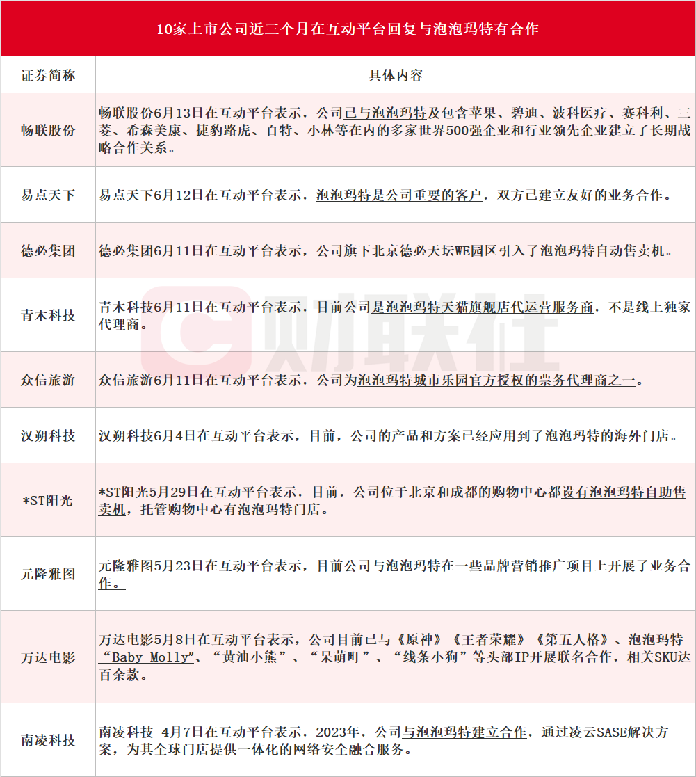 潮玩巨头泡泡玛特股价最近一年多累计暴涨超十倍,今年4月推出的Labubu3.0系列更在全球引发抢购潮。A股方面,元隆雅图收盘斩获11天7板。 据不完全整理,畅联股份、易点天下、德必集团、青木科技、众信旅游、汉朔科技、*ST阳光、元隆雅图、万达电影和南凌科技在内的10家上市公司于近三个月在互动易回复与泡泡玛特有合作。 注:8天4板哈尔斯今日在互动平台回复,与泡泡玛特的合作已终止,且前期合作的范围不包括Labubu。 ![]() (文章来源:财联社) |