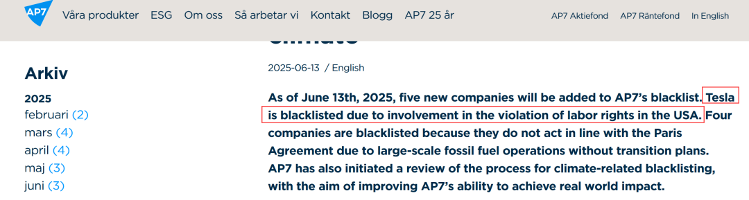 【导读】特斯拉被瑞典养老基金“拉黑”、清仓 屋漏偏逢连夜雨。 6月13日,瑞典养老基金AP7表示,已将五家企业列入黑名单,其中包括美国电动车制造商特斯拉(Tesla)。 ![]() AP7表示,该基金已于5月底清空所持的全部特斯拉股份,当时特斯拉市值约为13.6亿美元,约占AP7股票基金的1%。 AP7在声明中表示:“AP7已决定将特斯拉列入黑名单,原因是特斯拉在美国存在已被证实的劳动权利侵犯行为。尽管我们与特斯拉进行了数年对话,并曾与其他投资者合作提出股东提案,但该公司并未采取足够措施来解决这些问题。” 根据AP7官网,截至5月底,该基金总资产为1.181万亿瑞典克朗(约合人民币近9000亿元)。 值得注意的是,这并不是特斯拉首次被欧洲国家的养老金基金“拉黑”。 据彭博社报道,今年3月,丹麦的Akademiker Pension养老基金,因对特斯拉劳工权利以及马斯克言行的担忧,已将特斯拉列入其“黑名单”,并出售了持仓。这意味着无论是基金本身还是其外部管理者都不能购买特斯拉股票。值得注意的是,Akademiker Pension的特斯拉持股在高峰期价值3亿丹麦克朗(约合人民币3.3亿元)。 此前,欧洲最大的养老基金ABP在去年第三季度“清仓”了其持有的特斯拉公司全部5.71亿欧元(约合5.85亿美元)股份。 数据显示,去年,特朗普赢得美国大选后,特斯拉加速上涨,并在去年12月创下历史新高488.54美元/股。随着特斯拉销量下滑,机构投资者对马斯克不能专心为特斯拉工作而屡屡发难,特斯拉股价一度“腰斩”。 虽然特朗普为特斯拉“站台”,股价得以短暂回升,但是随着近日特朗普和马斯克“决裂”,特斯拉股票再度下挫。 不过,美国国家公路交通安全管理局(NHTSA)在6月13日表示,将放宽阻碍特斯拉自动驾驶出租车发展的法规。 6月13日盘中,特斯拉股价一度拉升超4%。截至收盘,涨幅收窄,股价报收325美元/股,总市值为1万亿美元。 (文章来源:中国基金报) |