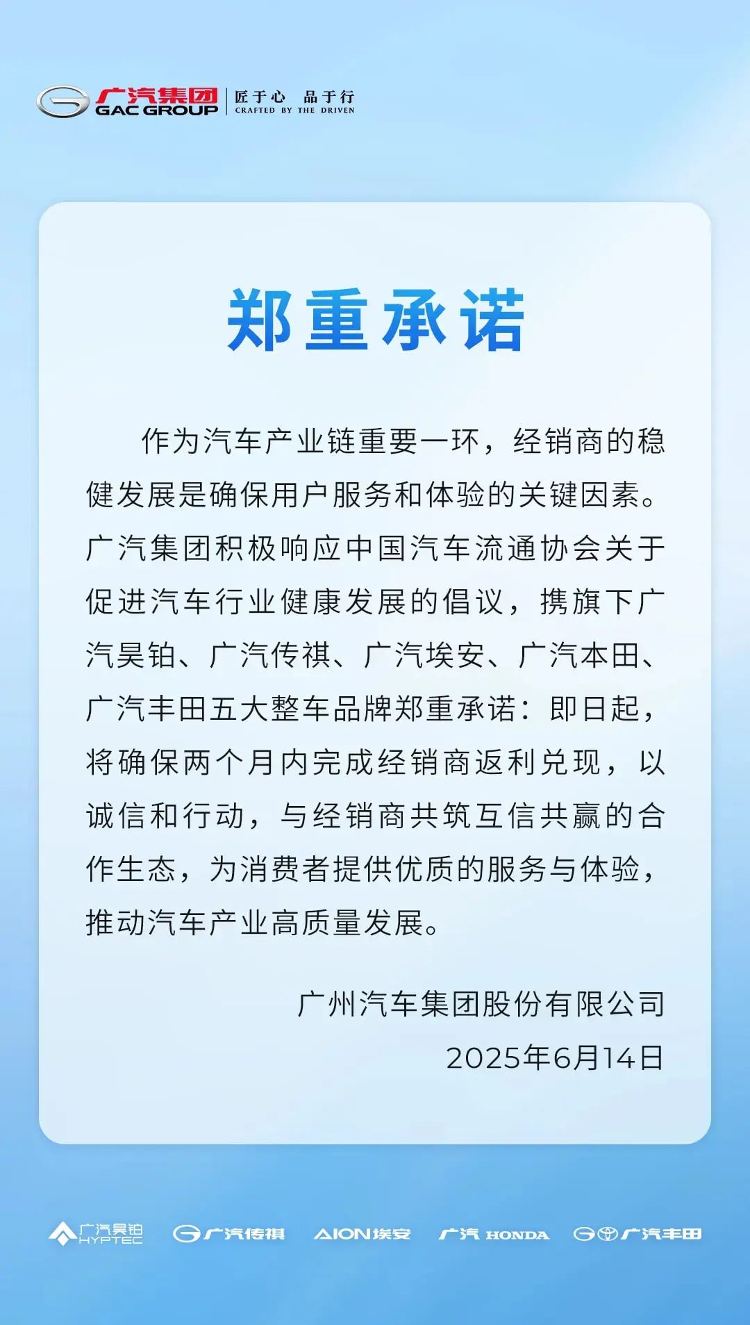 6月14日,广汽集团发布承诺公告:作为汽车产业链重要一环,经销商的稳健发展是确保用户服务和体验的关键因素。广汽集团积极响应中国汽车流通协会关于促进汽车行业健康发展的倡议,携旗下广汽昊铂、广汽传祺、广 ...