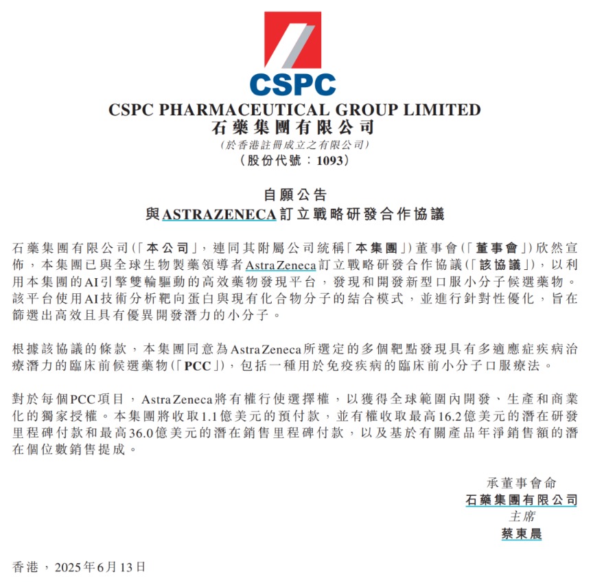 石药集团此前预告过的大BD(商务拓展或商务开发)正式落地。 该项与跨国药企阿斯利康的战略合作是聚焦AI驱动的药物研发项目,涉及金额超53亿美元(约为380亿元人民币),远超石药集团2024年290亿元的营收规模。 6月13日,石药集团股价以8.84港元/股报收,最新市值为1018亿港元。 超53亿美元 石药集团6月13日晚公告称,公司已与全球生物制药领导者阿斯利康订立战略研发合作协议,以利用集团的AI引擎双轮驱动的高效药物发现平台,发现和开发新型口服小分子候选药物。该平台使用AI技术分析靶向蛋白与现有化合物分子的结合模式,并进行针对性优化,旨在筛选出高效且具有优异开发潜力的小分子。 ![]() 根据该协议的条款,石药集团同意为阿斯利康所选定的多个靶点发现具有多适应症疾病治疗潜力的临床前候选药物(PCC),包括一种用于免疫疾病的临床前小分子口服疗法。 对于每个PCC项目,阿斯利康将有权行使选择权,以获得全球范围内开发、生产和商业化的独家授权。石药集团将收取1.1亿美元的预付款,并有权收取最高16.2亿美元的潜在研发里程碑付款和最高36.0亿美元的潜在销售里程碑付款,以及基于有关产品年净销售额的潜在个位数销售提成。 “预告式BD” 石药集团的此项BD,在5月30日早间曾预告过。 公司当时公告称,目前正与若干独立第三方就三项潜在交易进行磋商,涉及若干产品(包括表皮生长因子受体抗体药物偶联物及由集团技术平台开发的其他药品)在开发、生产及商业化方面的授权及合作。 每项潜在交易项下,第三方应付予的潜在首付款、潜在开发里程碑付款及潜在商业化里程碑付款,合计或达到约50亿美元。三项潜在交易中的其中一项已处于后期阶段,预计将于6月完成。 此后,石药集团股价持续震荡上行。 石药集团目前业绩不佳。2024年,公司实现营收290.09亿元,同比下降7.76%;归母净利润为43.28亿元,同比下降26.31%。这是石药集团近10年来首次营收、净利双双下滑。2025年一季度,石药集团营业收入为70.15亿元,同比下滑21.91%;归母净利润为14.78亿元,同比下降8.36%。 类似石药集团的这种“预告式BD”正在增多。 6月12日早间,中国生物制药核心子公司正大天晴发文称,在近日召开的第46届高盛全球医疗健康年会上,中国生物制药资本市场负责人雷鸣透露,今年以来,对外授权(out-licensing)已成为公司最重要的战略目标之一,针对多款具备全球商业化潜力的创新资产,公司已与多家跨国药企与明星生物科技公司展开深度洽谈,并有一笔标志性的重磅对外授权交易将于近期落地。 受此消息刺激,6月12日,中国生物制药股价暴涨近20%。 (文章来源:中国基金报) |