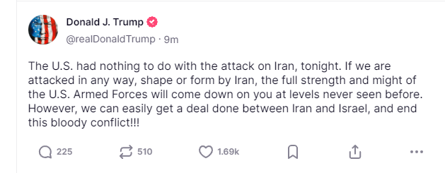 美东时间15日凌晨,美国总统特朗普在社交平台上称,“美国与伊朗今晚遭袭事件无关”,并警告说,若伊朗以任何形式对美方发动攻击,美国武装力量将“以空前规模全力回击”。 此外,特朗普还声称,美方可以“轻 ...