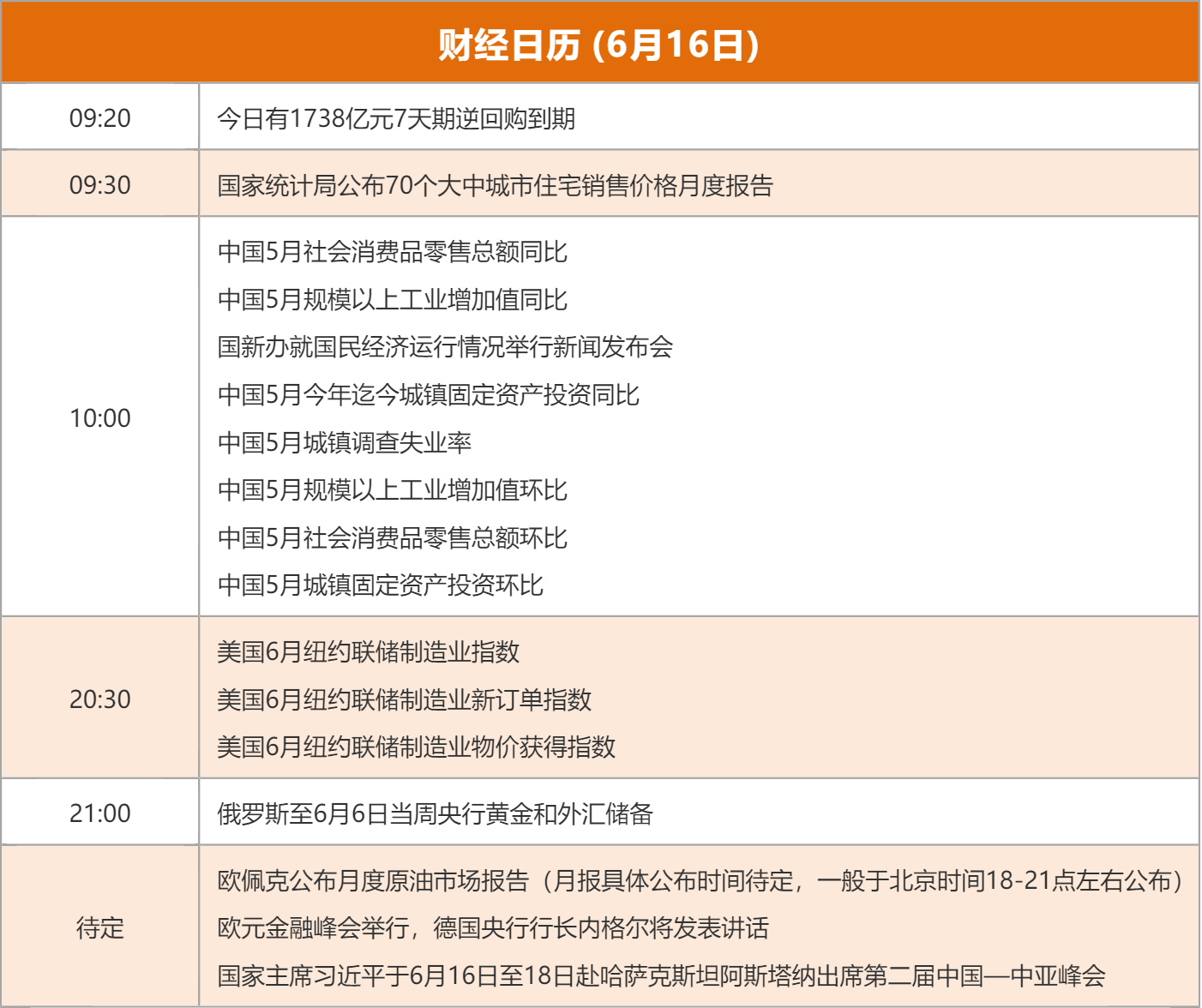 ![]() 每日精选中亚峰会: 应哈萨克斯坦共和国总统托卡耶夫邀请,国家主席习近平将于6月16日至18日赴哈萨克斯坦阿斯塔纳出席第二届中国-中亚峰会。 国常会: 李强主持召开国务院常务会议,听取构建房地产发展新模式和推进好房子建设有关情况汇报。会议指出,要对全国房地产已供土地和在建项目进行摸底,进一步优化现有政策,提升政策实施的系统性有效性,多管齐下稳定预期激活需求、优化供给、化解风险,更大力度推动房地产市场止跌回稳。 李强主持召开国务院常务会议,研究优化药品和耗材集采有关举措。会议指出,要加强药品和耗材集采政策评估,总结经验、补齐短板,推动集采工作规范化制度化常态化开展。 李强主持召开国务院常务会议,部署中国(上海)自由贸易试验区试点措施复制推广工作。会议指出,要用好中国(上海)自由贸易试验区全面对接国际高标准经贸规则的试点经验,在更大范围释放制度创新红利,以高水平开放推动深层次改革、高质量发展。 中国5月金融数据: 5月末,广义货币(M2)余额325.78万亿元,同比增长7.9%。5月末,本外币贷款余额270.2万亿元,同比增长6.7%。月末人民币贷款余额266.32万亿元,同比增长7.1%。前五个月人民币贷款增加10.68万亿元。前五个月社会融资规模增量累计为18.63万亿元。 中国货币政策: 为保持银行体系流动性充裕,2025年6月16日,将以固定数量、利率招标、多重价位中标方式开展4000亿元买断式逆回购操作,期限为6个月(182天)。 红筹股二次上市: 深圳民革官微刊发了民革深圳市委会主委何杰谈深圳综改新使命的文章。何杰称,据悉深圳相关部门正在制定相关上市规则,有望试点红筹股二次上市,将为科创企业提供更加便捷高效的上市渠道。何杰表示,综合改革“2.0”的蓝图已经绘就,关键在于抓好落地落实。许多改革仍属于框架性、方向性的部署,需要结合实践需求,特别是做到“顶层设计与地方首创”的有机结合。 中东局势: 当地时间6月14日,俄罗斯总统助理乌沙科夫表示,当天俄罗斯总统普京与美国总统特朗普进行了通话,通话持续约50分钟。在通话中,双方讨论了以色列与伊朗间的紧张局势。普京向特朗普介绍了与以色列总理内塔尼亚胡和伊朗总统佩泽希齐扬的通话情况。 美东时间15日凌晨,美国总统特朗普在社交平台上称,“美国与伊朗今晚遭袭事件无关”,并警告说,若伊朗以任何形式对美方发动攻击,美国武装力量将“以空前规模全力回击”。此外,特朗普还声称,美方可以“轻松促成结束这场血腥冲突的协议”,但并未详细说明如何达成协议。美国总统特朗普表示,美国有可能会介入伊朗与以色列之间的冲突。特朗普在周日接受美国广播公司采访时表示:“我们有可能会介入。”他指出,美国“目前并未介入”。特朗普表示:“我们很快就会在以色列和伊朗之间实现和平!现在正有许多通话和会面在进行中。我做了很多事,却从未获得任何认可......”。当地时间6月15日,以色列总理内塔尼亚胡表示,如果伊朗接受美国提出的放弃其核计划的要求,以色列愿意停止其行动。 热点题材医药: 市场监管总局新闻发言人、新闻宣传司司长王秋苹在新闻发布会上表示,下一步,将持续加大医药领域反垄断执法力度,对于任何威胁群众用药安全、推高民生成本的违法行为,保持“利剑高悬”的高压态势,守护好群众“救命药”“安心价”,绝不让企业“带病经营”损害群众健康,绝不让市场“蒙眼逐利”侵蚀公共利益。 14部委联合发布了《关于印发2025年纠正医药购销领域和医疗服务中不正之风工作要点》,共分为4个部分15项内容。《工作要点》指出,要持续深化医药购销领域治理,紧盯“关键少数”和关键岗位,聚焦药品、高值医用耗材、医用设备、基建和信息化项目招投标、后勤服务等监管重点,持续规范检测样本外送、外配处方、项目审批、资金使用等关键环节行为,加大行政执法和司法办案力度。 出境旅游: 新西兰政府官网发文指出,从2025年11月起,中国护照持有者如从澳大利亚入境,且持有有效澳大利亚旅游、工作、学生或家庭签证,将可免签进入新西兰,最长停留3个月。 赛马: 《广州市提振消费专项行动实施方案(征求意见稿)》公开征求意见。其中提到,大力发展体育消费。全力抓好十五运会和残特奥会广州赛区筹办工作,高水平办好世界田联接力赛、广州马拉松赛等重大赛事。支持花都融创等冰雪场馆提质升级,加快推进香港马会从化马场建设和运营,推动冰雪运动和赛马运动消费发展。 房地产: 广州市发布《提振消费专项行动实施方案(征求意见稿)》,面向社会公开征求意见。方案明确提出有序减少消费限制。优化房地产政策,全面取消限购、限售、限价,降低贷款首付比例和利率。 核能核电: 多家媒体报道,世界银行执行董事会已宣布解除对于支持核电项目融资的禁令。世界银行行长表示,该行还将助力全球开发“小型模块化反应堆”,以推动核电系统进一步普及。业内人士指出,特朗普政府对核电的倡导,以及德国新政府在核能立场方面的转变,促使了世界银行的转变。当前,欧盟范围内也再次出现支持核能的潮流。 脑机接口: 近日,中国科学院脑科学与智能技术卓越创新中心联合复旦大学附属华山医院,与相关企业合作,成功开展了我国首例侵入式脑机接口的前瞻性临床试验。该成果标志着我国在侵入式脑