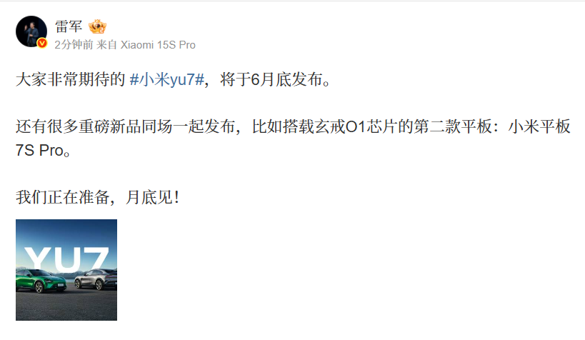 小米雷军发布微博称,大家非常期待的小米yu7,将于6月底发布。 还有很多重磅新品同场一起发布,比如搭载玄戒O1芯片的第二款平板:小米平板7S Pro。