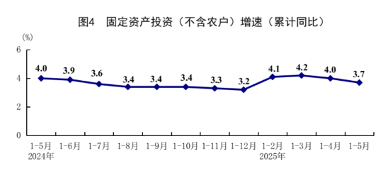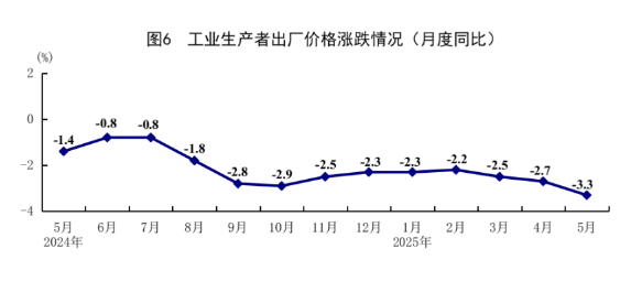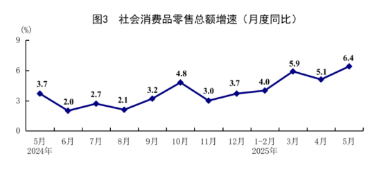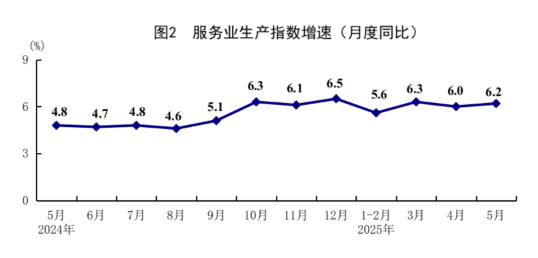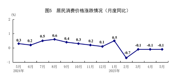 5月份,在以习近平同志为核心的党中央坚强领导下,各地区各部门认真贯彻落实党中央、国务院决策部署,坚持稳中求进工作总基调,完整准确全面贯彻新发展理念,加快构建新发展格局,扎实推动高质量发展,加紧实施更加积极有为的宏观政策,国民经济顶住压力平稳运行,生产需求稳定增长,就业形势总体稳定,新动能成长壮大,高质量发展向优向新。 一、工业生产平稳增长,装备制造业和高技术制造业增长较快 5月份,全国规模以上工业增加值同比增长5.8%,环比增长0.61%。分三大门类看,采矿业增加值同比增长5.7%,制造业增长6.2%,电力、热力、燃气及水生产和供应业增长2.2%。装备制造业增加值同比增长9.0%,高技术制造业增加值增长8.6%,分别快于全部规模以上工业增加值3.2和2.8个百分点。分经济类型看,国有控股企业增加值同比增长3.8%;股份制企业增长6.3%,外商及港澳台投资企业增长3.9%;私营企业增长5.9%。分产品看,3D打印设备、工业机器人、新能源汽车产品产量同比分别增长40.0%、35.5%、31.7%。1-5月份,全国规模以上工业增加值同比增长6.3%。5月份,制造业采购经理指数为49.5%,比上月上升0.5个百分点;企业生产经营活动预期指数为52.5%,上升0.4个百分点。1-4月份,全国规模以上工业企业实现利润总额21170亿元,同比增长1.4%。 ![]() 二、服务业增长加快,现代服务业增势良好 5月份,全国服务业生产指数同比增长6.2%,比上月加快0.2个百分点。分行业看,信息传输、软件和信息技术服务业,租赁和商务服务业,批发和零售业生产指数同比分别增长11.2%、8.9%、8.4%,分别快于服务业生产指数5.0、2.7、2.2个百分点。1-5月份,全国服务业生产指数同比增长5.9%。1-4月份,规模以上服务业企业营业收入同比增长7.2%。5月份,服务业商务活动指数为50.2%,比上月上升0.1个百分点;服务业业务活动预期指数为56.5%,上升0.1个百分点。其中,铁路运输、航空运输、邮政、电信广播电视及卫星传输服务、互联网软件及信息技术服务等行业商务活动指数位于55.0%以上较高景气区间。 ![]() 三、市场销售明显回升,以旧换新相关商品快速增长 5月份,社会消费品零售总额41326亿元,同比增长6.4%,比上月加快1.3个百分点;环比增长0.93%。按经营单位所在地分,城镇消费品零售额36057亿元,同比增长6.5%;乡村消费品零售额5269亿元,增长5.4%。按消费类型分,商品零售额36748亿元,增长6.5%;餐饮收入4578亿元,增长5.9%。基本生活类和部分升级类商品销售增势较好,限额以上单位粮油食品类、金银珠宝类、体育娱乐用品类商品零售额分别增长14.6%、21.8%、28.3%。消费品以旧换新政策持续显效,限额以上单位家用电器和音像器材类、通讯器材类、文化办公用品类、家具类商品零售额分别增长53.0%、33.0%、30.5%、25.6%。1-5月份,社会消费品零售总额203171亿元,同比增长5.0%。全国网上零售额60402亿元,同比增长8.5%。其中,实物商品网上零售额49878亿元,增长6.3%,占社会消费品零售总额的比重为24.5%。1-5月份,服务零售额同比增长5.2%。 ![]() 四、固定资产投资继续扩大,制造业投资增长较快 1-5月份,全国固定资产投资(不含农户)191947亿元,同比增长3.7%;扣除房地产开发投资,全国固定资产投资增长7.7%。分领域看,基础设施投资同比增长5.6%,制造业投资增长8.5%,房地产开发投资下降10.7%。全国新建商品房销售面积35315万平方米,同比下降2.9%;新建商品房销售额34091亿元,下降3.8%。分产业看,第一产业投资同比增长8.4%,第二产业投资增长11.4%,第三产业投资下降0.4%。民间投资同比持平;扣除房地产开发投资,民间投资增长5.8%。高技术产业中,信息服务业,航空、航天器及设备制造业,计算机及办公设备制造业,专业技术服务业投资同比分别增长41.4%、24.2%、21.7%、11.9%。5月份,固定资产投资(不含农户)环比增长0.05%。 ![]() 五、货物进出口持续增长,贸易结构继续优化 5月份,货物进出口总额38098亿元,同比增长2.7%。其中,出口22767亿元,增长6.3%;进口15331亿元,下降2.1%。1-5月份,货物进出口总额179449亿元,同比增长2.5%。其中,出口106682亿元,增长7.2%;进口72767亿元,下降3.8%。1-5月份,一般贸易进出口增长0.8%,占进出口总额的比重为64.2%。民营企业进出口增长7.0%,占进出口总额的比重为57.1%,比上年同期提高2.4个百分点。机电产品出口增长9.3%,占出口总额的比重为60.0%。 六、就业形势总体稳定,城镇调查失业率下降 1-5月份,全国城镇调查失业率平均值为5.2%。5月份,全国城镇调查失业率为5.0%,比上月下降0.1个百分点。本地户籍劳动力调查失业率为5.0%;外来户籍劳动力调查失业率为5.0%,其中外来农业户籍劳动力调查失业率为4.9%。31个大城市城镇调查失业率为5.0%,比上月下降0.1个百分点。全国企业就业人员周平均工作时间为48.5小时。 七、居民消费价格低位运行,核心CPI温和回升 5月份,全国居民消费价格(CPI)同比下降0.1%,环比下降0.2%。分类别看,食品烟酒价格同比上涨0.1%,衣着价格上涨1.5%,居住价格上涨0.1%,生活用品及服务价格上涨0.1%,交通通信价格下降4.3%,教育文化娱乐价格上涨0.9%,医疗保健价格上涨0.3%,其他用品及服务价格上涨7.3%。在食品烟酒价格中,鲜菜价格下降8.3%,粮食价格下降1.4%,猪肉价格上涨3.1%,鲜果价格上涨5.5%。扣除食品和能源价格后的核心CPI同比上涨0.6%,涨幅比上月扩大0.1个百分点。1-5月份,全国居民消费价格同比下降0.1%。 ![]() 5月份,全国工业生产者出厂价格同比下降3.3%,