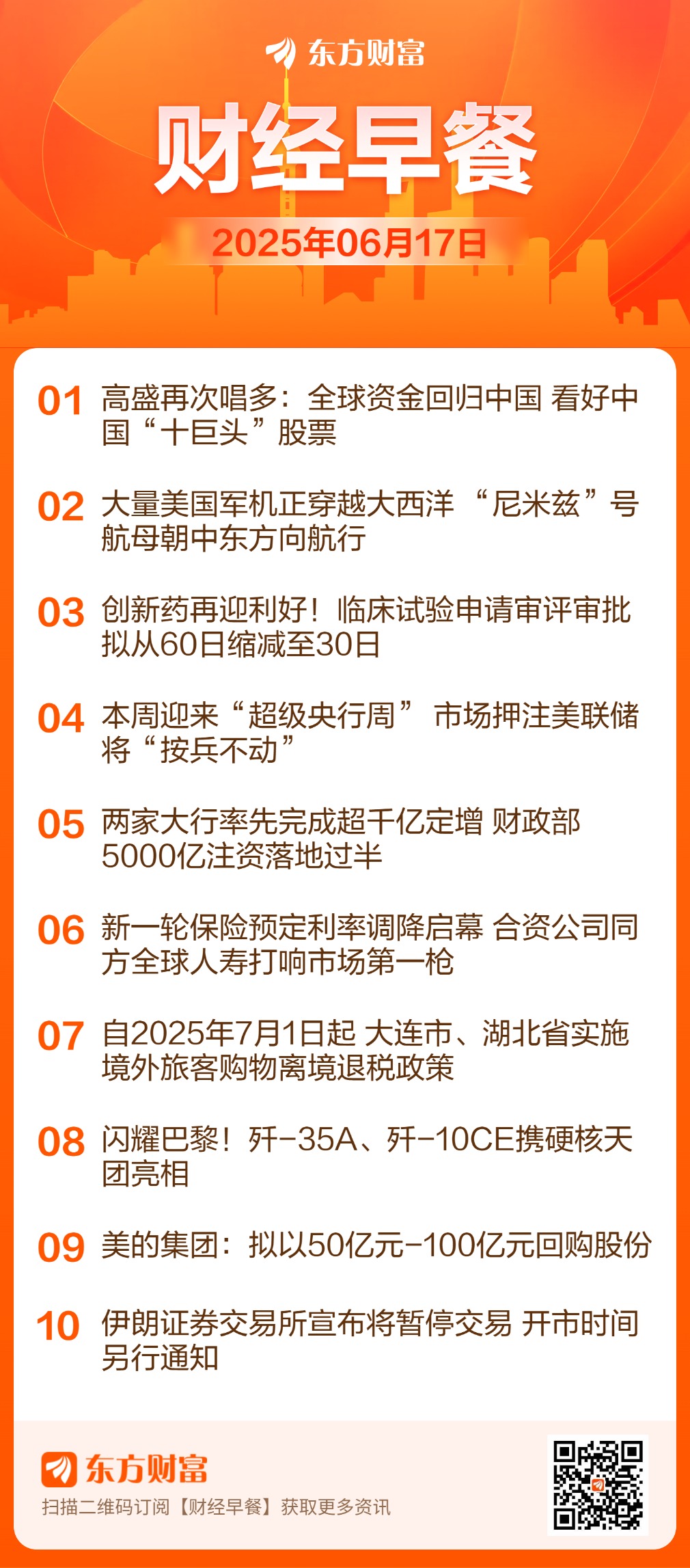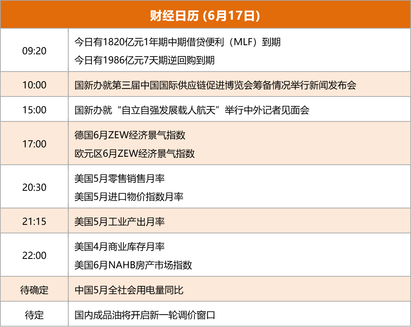 ![]() 每日精选中东局势: 据报道,自当地时间15日晚开始,“至少30架”美国空军加油机正穿越大西洋,报道称这是美国空军一次“规模空前”的跨大西洋部署。飞行轨迹数据图显示,有26架KC-135和KC-46加油机从美国境内多地起飞向东穿越大西洋。报道称,这类加油机的主要功能是为参与远离本土基地实施空袭的军用机进行加油,目前跨大西洋飞行的飞机数量仍在上升,数字约在30架以上。 据报道,当地时间6月16日凌晨,伊朗向以色列再次发射约100枚导弹。不过这一数字目前尚未得到以色列军方的核实。此前多家美国媒体报道,美国总统特朗普否决了以色列向美国提出的刺杀伊朗最高领袖哈梅内伊的计划。 据以色列军方一名官员当地时间6月16日下午称,以色列空军已开始对伊朗中部发动新一轮空袭。 外交部发言人在回答记者有关当前中东局势的提问时表示,呼吁双方通过对话解决分歧,双方应该立即采取措施,为冲突升级踩刹车,为紧张局势降温。中方将继续同有关各方保持沟通,劝和促谈,避免地区局势进一步动荡。 中国5月工业生产数据: 国家统计局公布数据显示,5月份,全国规模以上工业增加值同比增长5.8%,环比增长0.61%。总的来看,5月份,随着政策组合效应持续释放,稳经济促发展效果显现,国民经济保持总体平稳、稳中有进发展态势,充分展现了我国经济的韧性和活力。 房地产: 国家统计局公布数据显示,2025年5月份,70个大中城市中,各线城市商品住宅销售价格环比下降,同比降幅继续收窄。一线城市新建商品住宅销售价格环比由上月持平转为下降0.2%。二线城市新建商品住宅销售价格环比由上月持平转为下降0.2%。三线城市新建商品住宅销售价格环比下降0.3%,降幅比上月扩大0.1个百分点。 国家统计局新闻发言人、国民经济综合统计司司长付凌晖在国新办发布会上介绍,今年以来,随着各项稳定房地产政策加快落实,房地产市场继续朝着止跌回稳的方向迈进。有分析称,对已供应土地、在建项目进行摸底,是进一步优化已出台政策的关键一步。未来有关部门及各地有望在进一步加大政策力度的同时,提升政策实施的精准性、有效性。 中国“十巨头”: 近日,高盛首席中国股票策略师刘劲津发布名为《中国民营企业的回归:潮流已经逆转》的研究报告。刘劲津指出,在各种宏观、政策和微观因素驱动下,中国民营企业的中期投资前景正在改善。高盛还仿效美股“七巨头”,列出了中国“十巨头”,他们分别是,腾讯、阿里巴巴、小米、比亚迪、美团、网易、美的、恒瑞医药、携程和安踏。高盛预计,中国民营企业领域在股市的集中度将上升,“十巨头”有望从中获得进一步的增长动力。 超级央行周: 本周,迎来备受瞩目的“超级央行周”。按照日程安排,美联储、日本央行、英国央行等多国央行将公布利率决议。对于颇受关注的美联储降息步调,市场押注美联储本次“按兵不动”的概率接近100%。此外,市场普遍预计各国央行将保持谨慎。 热点题材创新药: 国家药品监督管理局发布《关于优化创新药临床试验审评审批有关事项的公告(征求意见稿)》。其中提到,为进一步支持以临床价值为导向的创新药研发,提高临床研发质效,对符合要求的创新药临床试验申请在30个工作日内完成审评审批。 离境退税: 财政部网站公告,大连市人民政府、湖北省人民政府根据有关规定,就其境外旅客购物离境退税政策实施方案向财政部、海关总署和国家税务总局申请备案,经审核,予以备案。大连市、湖北省自2025年7月1日起,按照有关规定实施境外旅客购物离境退税政策。 保险“降息”: 进入6月,人身险产品停售现象日益增多,市场多款2.5%预定利率的储蓄险已赶在三季度前离场,各家公司正锚定“保障+储蓄”重构产品矩阵。与此同时,已有合资险企同方全球人寿率先打响市场“第一枪”,其上新的两款分红险产品,预定利率已从目前市场2%的上限下调50BP至1.5%。 核电: 今年以来,核电领域利好消息不断。近期,世界银行的一项决定结束了该行自1959年以来对核能项目的融资禁令。据有关媒体报道,世界银行行长彭安杰在发给员工的内部邮件中宣布,该行将与联合国核监督机构国际原子能机构建立合作关系,“重新进入核能领域”。 IP经济: 多位网友发视频称,浙江杭州西溪天街泡泡玛特新店当天开业,但仅两小时商品就被买完,提前关门,消息冲上热搜榜首。有网友称,杭州这家泡泡玛特新店开门后,一批疑似黄牛人员迅速涌入并“端盒”,导致普通消费者无法购得商品,两小时后门店就关了。还有现场顾客透露,排了4小时队。 AI数字人: 交个朋友公司创新推出“罗永浩数字人直播专场”,在百度电商平台首播,单场总交易额(GMV)突破5500万元。据了解,整场直播AI调用知识库1.3万次,实时生成专业解说内容9.7万字;双数字人搭档通过8300余次精准动作和自然交互,完成商品展示、粉丝答疑等全流程操作,首次实现“类人级”直播体验。 车市“反内卷”: 继多家车企承诺向上游供应商支付账期统一至60天内,下游经销商的返利账期也引起车企关注,车市“反内卷”再下一城。近日广汽集团发布承诺公告,将确保两个月内完成经销商返利兑现,推动汽车产业高质量发展。根据中国汽车流通协会相关人士的消息,承诺60天内向下游经销商返利的车企还包括宝马、北汽新能源、上汽通用、一汽奥迪、悦达起亚