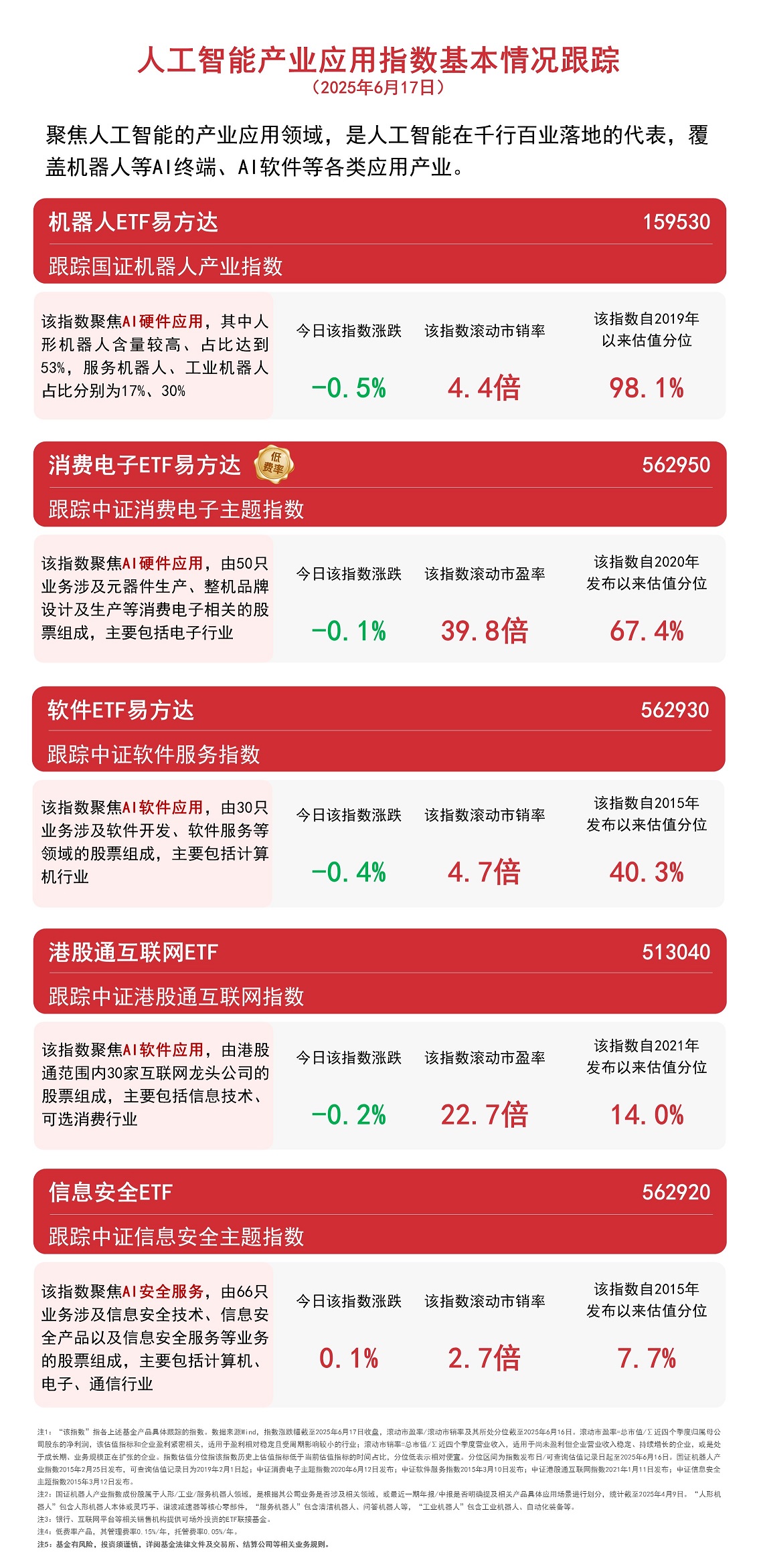 截至收盘,国证机器人产业指数下跌0.5%,中证信息安全主题指数上涨0.1%,中证消费电子主题指数下跌0.1%,中证港股通互联网指数下跌0.2%,中证软件服务指数下跌0.4%。 国内首个人形机器人全产业链专业展“2025杭州国际人形机器人与机器人技术展览会”,将于6月20-22日在杭州举办。特斯拉、宇树等行业头部企业及杭州 “六小龙” 企业参展,近300家知名企业将展示仿生驱动、具身智能、脑机接口等先进技术及机器人上下游产业链成果。
