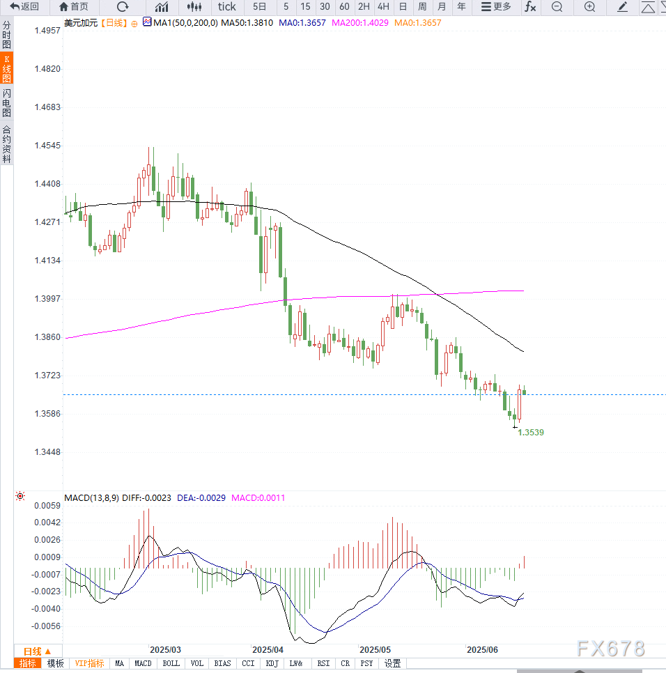 美元兑加元(USD/CAD)周三亚洲盘初延续跌势,继前一交易日下跌逾0.5%后,目前交投于1.3660水平。美联储利率决议临近,美元在方向选择上表现犹豫,为加元提供喘息空间。 ![]() 虽然美联储鸽派预期令美元承压,但中东地区紧张局势仍对美元构成一定支撑。以色列可能加大对伊朗的打击力度,美国或考虑扩大参与行动。特朗普在加拿大G7峰会后表示,美方希望“永久切断伊朗通往核武器的道路”,暗示冲突升级的可能性。 这种不确定性推动避险资金回流美元,短期内对美元兑加元形成支撑,但由于投资者整体聚焦于货币政策,地缘驱动仍显被动。 据市场调查显示,加拿大总理卡尼与美国总统特朗普在G7阿尔伯塔峰会期间会晤,并意外表示双方同意力争在30天内完成一项经济与安全协议。这一表态改善市场对加美经贸关系的预期,提升加元基本面人气。 不过,加拿大官员随后指出,距离签署协议仍有大量细节需谈判,突显两国之间尚未完全达成共识。因此,市场对此持谨慎乐观态度。 美元兑加元在跌破1.3700关口后承压回落,目前临近1.3660关键技术位。若进一步跌破,将指向1.3630支撑区域,即5月末上行缺口起点。 当前日线图显示动能指标转弱,MACD呈死叉迹象,短期或延续震荡偏弱格局。若跌破1.3630,后续目标可能指向1.3580一线。 反之,若中东风险突然升级、美元重新上扬,则汇价可能回测1.3700和1.3745区域,前者为20日均线压力位,后者为上周高点。 ![]() 美元兑加元走势受多重因素交织影响,包括美联储政策前景、加美双边合作预期、美国经济数据表现及地缘紧张情绪。 整体而言,若美联储强化9月降息信号,而中东局势未进一步升级,美元兑加元或将面临更深的修正压力。短线关注1.3630支撑有效性,长线需看新协议进展是否转化为加元持续买盘动能。 ![]() |