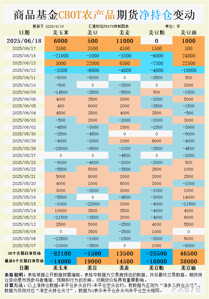 周四(6月19日)我们观察到,芝加哥期货交易所(CBOT)谷物市场周三展现分化走势,受小麦短线空头回补推动,市场情绪有所提振。美小麦7月合约,创3月24日以来新高;美大豆7月合约(SN25);美玉米7月合约均小幅上行。美豆油期约持平,美豆粕则小幅回落。 ![]() 小麦市场周三表现最为强劲,7月合约飙升25-1/4美分,收于5.74-1/4美元/蒲式耳。持仓数据显示,6月18日基金增加小麦净多头11000手,最近5个交易日净多头增仓14500手,30个交易日累计增仓13500手,显示投机资金对小麦看涨情绪升温。基本面看,美国冬小麦收获因俄克拉荷马及堪萨斯湿润天气放缓,叠加俄乌局势不确定性和欧洲干旱担忧,触发短线空头回补。知名机构分析师Terry Linn指出,基金在小麦上的庞大净空头头寸使其易受短线反弹驱动,而阿尔及利亚本周采购超50万吨小麦的招标进一步提振出口预期。 基差方面,美国硬红冬小麦现货基差稳定,如堪萨斯Wichita报价-25美分/蒲式耳,农户因价格回升增加销售,限制基差上行空间。国际交易动态显示,俄乌局势为小麦价格提供潜在支撑,但黑海地区供应不确定性有所缓解,埃及近期取消招标反映全球需求疲软。USDA周五出口销售报告预期2025/26年度小麦出口净销售30-60万吨,数据表现或影响短期方向。 走势展望:小麦价格短期在5.60-5.90美元/蒲式耳区间震荡,地缘风险与天气因素可能延续短线支撑,但全球供应充裕限制上行空间。需关注USDA出口数据及黑海动态。 大豆:生物燃料需求与小麦比价提振,空头回补谨慎 大豆期货周三微涨,7月合约收于10.74-3/4美元/蒲式耳,创一个月高点后回吐部分涨幅。持仓数据显示,6月18日基金增加大豆净多头500手,最近5个交易日净多头增仓19000手,但30个交易日净空头增加1500手,反映短期看多情绪与中长期谨慎并存。基本面看,美国生物燃料政策预期提振国内豆油需求,间接支撑大豆价格。Linn指出,生物燃料需求改变了大豆供需格局,缓解了出口放缓担忧。 基差方面,美国国内大豆现货基差稳定,农户销售意愿因价格回升略增。国际交易方面,阿根廷6月上半月大豆交易额创年度峰值,7-8月锁定超100万吨出口,叠加巴西丰产预期,全球供应充裕压制价格。USDA出口销售预期显示,2024/25年度大豆出口净销售0-40万吨,新作0-20万吨,数据偏中性。乌克兰否决对大豆出口征收10%关税的提案,缓解供应担忧。 走势展望:大豆价格短期在10.60-10.90美元/蒲式耳区间整理,生物燃料需求与空头回补提供支撑,但南美供应压力限制反弹幅度。关注USDA出口数据及南美产量动态。 豆油:生物燃料需求支撑韧性,供应压力限制上行 豆油期货周三持平,未能延续上周因生物燃料政策预期引发的涨势。持仓数据显示,6月18日基金增加豆油净多头1000手,最近5个交易日净多头增仓38000手,30个交易日累计增仓46500手,显示投机资金对豆油看涨情绪较强。基本面看,美国生物燃料政策预期提振国内需求,支撑豆油价格韧性。 基差方面,美国豆油出口基差保持坚挺,反映需求支撑,但全球植物油供应充裕施压远期价格。加拿大油菜籽期货下跌,因大草原降雨预期缓解干旱,间接影响豆油市场情绪。USDA出口销售预期显示,2024/25年度豆油出口净销售0-2.2万吨,数据偏弱。国际交易方面,马来西亚棕榈油和欧洲油菜籽价格小幅上涨,但未能为豆油提供明显指引。 走势展望:豆油价格短期在47-49美分/蒲式耳区间震荡,生物燃料需求提供底部支撑,但全球油脂供应充裕限制上行空间。需关注USDA出口数据及全球油脂市场动态。 豆粕:需求疲软与库存低位博弈,价格偏弱运行 豆粕期货周三小幅下跌,7月合约承压。持仓数据显示,6月18日基金豆粕多空持平,最近5个交易日净空头增仓16000手,30个交易日净空头累计增加25500手,反映投机资金对豆粕看空情绪占主导。基本面看,巴西大豆集中到港,国内豆粕现货价格偏弱。国家粮油信息中心指出,6月上旬国内豆粕库存回升至40万吨,处于历史同期中等偏低水平,短期库存压力不大,限制价格跌幅。 基差方面,美国豆粕现货基差因出口需求疲软有所下滑,国内油厂压榨利润下降,挺价意愿增强。USDA出口销售预期显示,2024/25年度豆粕出口净销售15-35万吨,数据偏中性。国际交易方面,巴西8-9月船期大豆压榨利润较差,CNF报价升至465-473美元/吨,成本上升可能支撑远期价格。 走势展望:豆粕价格短期在290-305美元/短吨区间偏弱震荡,库存低位与需求疲软博弈,跌幅有限。需关注USDA出口数据及需求动态。 玉米:出口需求与天气利好并存,空头情绪主导 玉米期货周三小幅上涨,7月合约收于4.33-1/2美元/蒲式耳。持仓数据显示,6月18日基金增加玉米净多头6000手,但最近5个交易日净空头增仓14000手,30个交易日净空头累计增加82100手,显示中长期看空情绪占主导。基本面看,美国中西部未来6-10天降水量高于正常水平,作物产量前景乐观,压制价格。Linn指出,巴西丰产带来的出口竞争削弱美国玉米需求支撑。 基差方面,美国玉米现货基差稳定,农户销售意愿较低,限制基差上行。国际交易方面,USDA出口销售预期显示,2024/25年度玉米出口净销售60-120万吨,数据偏强,但巴西大丰收威胁全球需求。市场情绪受关税言论影响,短期方向取决于USDA周五出口数据。 走势展望:玉米价格短期在4.30-4.50美元/蒲式耳区间低位震荡,出口需求提供支撑,但南美供应压力限制反弹空间。需关注USDA出口数据及巴西产量动态。 未来趋势展望 CBOT谷