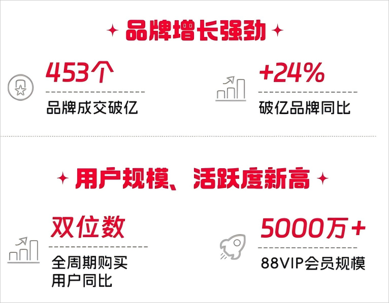 每经记者|陈婷 每经实习编辑|余婷婷 6月19日,天猫低调披露了今年“618”的战报。 《每日经济新闻》记者从天猫方面了解到,今年天猫“618”玩法简化,用户规模和活跃度创新高。截至6月18日24点,453个品牌在天猫“618”成交破亿元,同比去年增长24%。其中,苹果、美的、海尔、小米、华为、源氏木语、耐克、格力、斐乐、vivo、珀莱雅、阿迪达斯、欧莱雅等品牌跻身天猫“618”“10亿俱乐部”。 此外,高净值人群88VIP会员突破5000万,规模创新高;品牌会员数同比增长15%,品牌会员客单价达行业整体客单价的1.93倍。 值得一提的是,今年“618”,在京东火力全开的进攻下,美团闪购作为新玩家高调入局,淘宝闪购则联合饿了么参战,外界的关注度更多聚焦在这场外卖大战上。 据京东“618”战报,截至6月18日23:59,京东零售线上业务、线下业态及京东外卖整体订单量超22亿单,再创新高。6月9日,美团闪购公布“618”全周期数据:5月27日至6月18日,美团闪购下单用户数破亿,下单用户的人均消费金额增长近40%。截至记者发稿时,饿了么尚未发布相关数据。 复盘今年天猫“618”,与往年相比也有明显变化。 首先,在时间上,今年天猫“618”的开启比往年更早,第一波抢先购在5月13日就开启预售,在优惠活动的玩法上更简单直接,只设“官方立减”,基础优惠85折起,最高立减可达50%。 ![]() 图片来源:企业供图