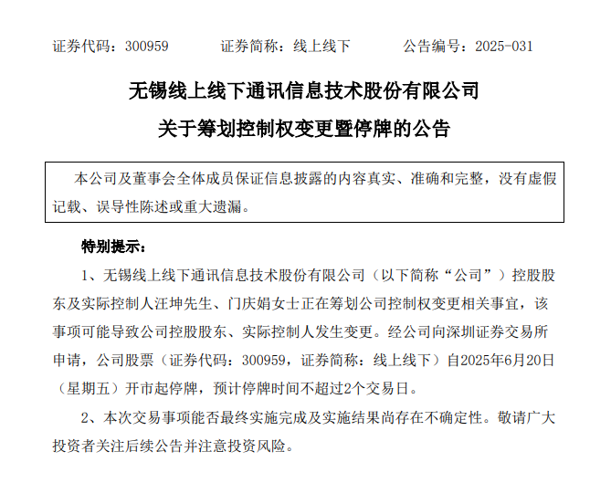 6月19日晚,线上线下(300959)发布公告称,公司于当日收到控股股东及实际控制人汪坤、门庆娟通知,其近日正在筹划公司控制权变更相关事宜,该事项可能导致公司控股股东、实际控制人发生变更。 图片来源:上 ...