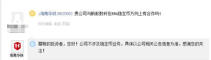 6月20日,蚂蚁数科于午后发布稳定币合作的澄清声明。 蚂蚁数科表示,近日注意到市场上有关于公司与海南华铁就RWA(Real World Assets,真实世界资产)及稳定币探讨合作的传闻,引发市场关注。 蚂蚁数科特此澄清,双方仅就RWA进行了非常初步的、探索性的交流,未达成任何形式的正式合作协议、商业安排或实质性项目落地。 此外,近期市场上存在部分公司借“RWA”、“稳定币”等热点概念进行炒作,暗示与蚂蚁数科之间的不实合作。请广大投资者和合作伙伴谨慎甄别市场传闻,注意投资风险。 ![]() 南财快讯记者注意到,涉事的另一方海南华铁(603300.SH)的股价在早间收盘前出现明显异动,一度触及涨停,不过午后开始回调走低,截至13时41分,涨幅仍超4.5%。 消息面上,据媒体报道,海南华铁微信号于20日11点24分左右发布了一篇文章,文中透露,蚂蚁数科与海南华铁就RWA稳定币生态等进行了探讨。 文章称,6月19日,蚂蚁数科Web3产品部总经理张晨光、新能源和可信产业事业部副总经理丁光敏一行赴海南华铁,就全资产上链技术、稳定币应用及RWA(现实世界资产代币化)领域展开深度合作交流。 上市公司透露,其此次与蚂蚁链的合作交流,旨在探讨将区块链技术深度嵌入算力设备生命周期管理,构建“可信设备”生态体系。海南华铁总经理胡丹锋称:“未来希望能进一步将算力作为基础资产,通过RWA的通证化实现资产流动性提升与全球投资者准入,这对海南华铁布局算力出海、拓展海外融资渠道将大有裨益。” 不过,截至目前,该文章已被删除。对此,南财快讯记者以投资者身份致电上市公司询问原因,接线人员表示,“其实我们只是简单发一个文章而已,就没有想引起这么大的波动。”该人员还透露,微信文章里面对稳定币的描述是很少的,主要描述RWA。但很多人觉得公司和稳定币挂钩了,所以按照稳定币的波动去炒作,这个就不合适了。 ![]() 值得一提的是,今日午间有投资者在互动易平台上向海南华铁提问“公司与蚂蚁数科在RWA稳定币方向上有合作吗?” 海南华铁快速回应称,公司不涉及稳定币业务,具体以公司相关公告信息为准。 ![]() 除了海南华铁透露与蚂蚁数科存在合作,多家A股上市公司也披露了合作情况。