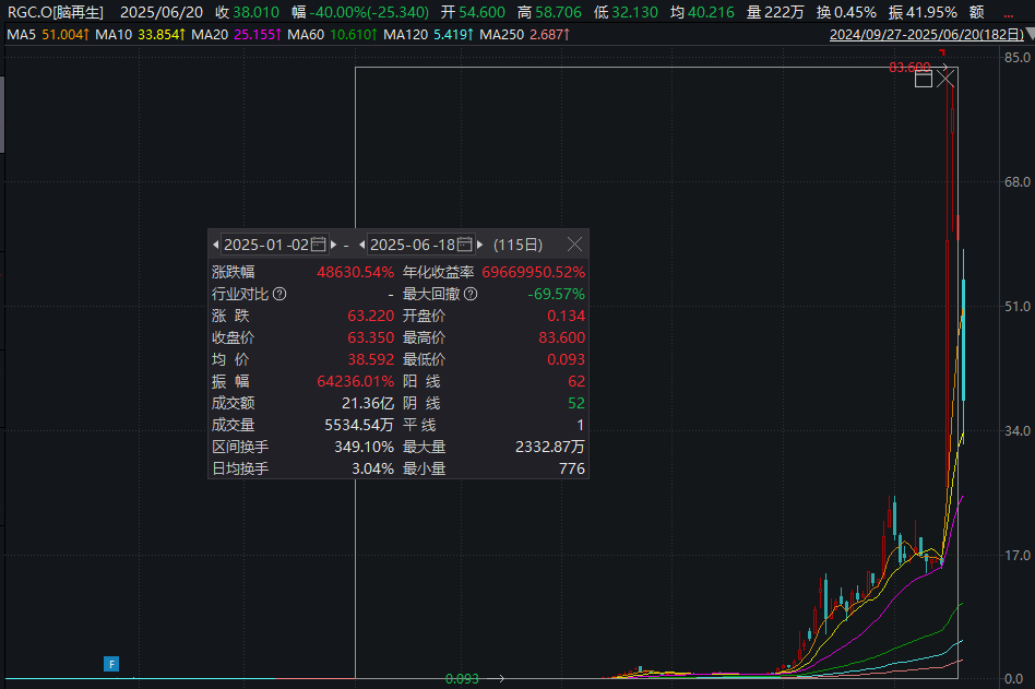 此前狂飙的脑再生科技股价突然大跌。 脑再生科技大跌40% 美东时间6月20日,脑再生科技盘中大幅下探。截至收盘,该股跌40%,股价报38.01美元/股,总市值为188亿美元(约合1349.82亿元人民币)。 此前有 ...