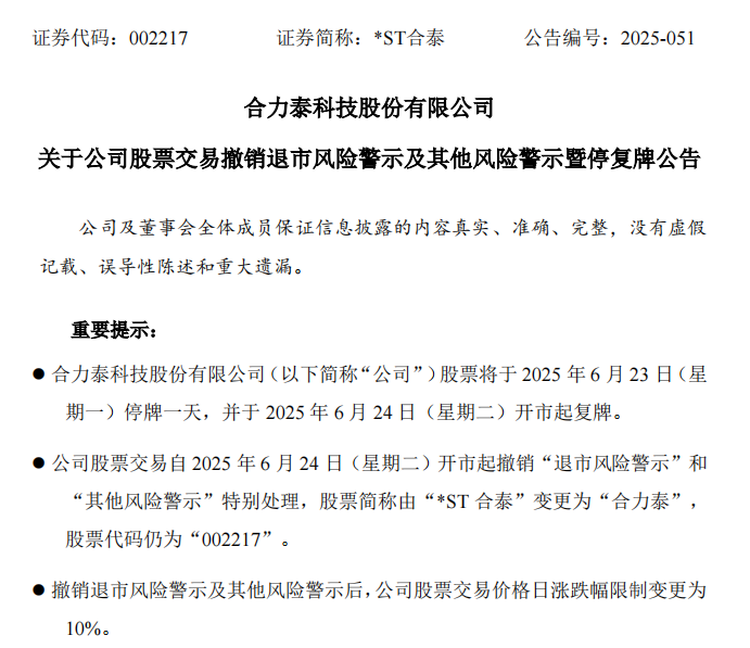 【导读】*ST合泰即将摘帽,证券简称由“*ST合泰”变更为“合力泰” 见习记者杨晨 在经历了一系列的重整后,*ST合泰迎来了“摘帽”时刻。 6月22日晚间,*ST合泰(合力泰科技股份有限公司;证券代码:002217)发布公告称,公司股票将于6月23日停牌一天,于6月24日开市起复牌并撤销退市风险警示和其他风险警示。 届时,该公司股票简称将由“ST合泰”变更为“合力泰”,股票代码仍为“002217”,日涨跌幅限制由5%变更至10%。 ![]() 重整后净资产回正 成功“摘帽” 因合力泰2023年度经审计的期末归属于上市公司股东的净资产为负值,该公司股票已于2024年5月6日起被实施退市风险警示。同时,因合力泰2021年至2023年连续三个会计年度经审计扣除非经常性损益前后净利润孰低者均为负值,且2023年度审计报告显示公司持续经营能力存在不确定性,公司股票已于2024年5月6日起被叠加实施其他风险警示。 资料显示,合力泰创立于2003年,系福建省电子信息集团控股的上市公司,产品包括新型显示、光电传感、FPC柔性线路板、新材料等,广泛应用于消费电子、智能穿戴、智慧零售、智能汽车、智能工控等诸多领域。 由于深陷债务危机且持续亏损,合力泰于2024年进行了司法重整。2024年12月31日,福州市中级人民法院裁定公司重整计划执行完毕。 根据会计师事务所对合力泰2024年度财务报表出具的带强调事项段的无保留意见的审计报告,公司2024年末归属于上市公司股东的净资产为18.56亿元,扣除后的营业收入为12.82亿元,利润总额为16.34亿元,归母净利润为15.19亿元,扣非净利润为-23.01亿元。 合力泰表示,公司经审计的2024年度期末净资产为正值,涉及退市风险警示的情形已消除。同时,会计师事务所出具了《关于公司2023年度财务报表审计报告非标准审计意见涉及事项影响已消除的专项说明的专项审核报告》,认为公司编制的专项说明符合《股票上市规则》的规定,公司相关事项的影响已消除。 故合力泰于4月28日向深交所提交了对公司股票交易撤销实施退市风险警示及其他风险警示的申请。目前该申请已获深交所审核同意。 2024年年报显示,由于重整计划执行完毕,合力泰的资产负债率由年初的193.91%降低至27.52%;归母净利润为15.19亿元,实现扭亏为盈;营业收入为13.27亿元,较上年同期减少71.35%,主因是公司战略性缩减业务板块,剥离了持续亏损的传统手机业务,聚焦电子纸和通用显示两大优势领域。 被证监会立案调查 管理层“大换血” 值得注意的是,尽管成功“摘帽”,当前合力泰仍面临着证监会立案调查尚未结案的风险。 此前的公告显示,合力泰于2025年4月28日收到中国证监会的《立案告知书》,公司因涉嫌信息披露违法违规,被中国证监会立案调查。同日,合力泰披露《关于前期会计差错更正公告》,结合自查发现的以前年度会计差错,对2023年度的合并财务报表及母公司财务报表进行重述。 截至目前,立案调查工作仍在进行中,合力泰表示,尚未收到中国证监会就上述立案事项的结论性意见或决定。 在此多事之秋,合力泰还刚经历了一场高管的人事大变动。 6月12日,该公司董事长黄爱武、副总经理马晓俊、财务总监李寅彦同日宣布辞职。 根据合力泰控股股东福建省电子信息(集团)有限责任公司的推荐,经公司审议,同意提名邓佳威为公司第七届董事会董事候选人,任期自股东会选举通过之日起至第七届董事会届满之日止。 该公司同日披露,聘任肖绪名为公司常务副总经理、林为群为公司财务总监、张长弘为公司副总经理,这些高级管理人员的任期与第七届董事会任期相同。 国海证券发布的研报显示,合力泰过去几年大规模的横向拓展使得资金链变得较为脆弱,最终将控股权转让给国资,以期在保障“规模”的基础上寻求继续成长的动能。在引入福建电子信息作为大股东后,经过半年的整合与洗礼,虽然现在的状态已经余裕得多,但在经历了去年三季度的“动荡”之后,如何在较少承担财务负担的情况下全力备战5G,是公司当下不得不面对的难题之一。 最新财报显示,2025年一季度,合力泰实现营业收入3.66亿元,同比增长8.63%;归母净利润为408.47万元,同比扭亏为盈。 合力泰表示,2025年公司将进一步做大做强现有电子纸、通用显示两个优势板块。 截至6月20日,*ST合泰股价收于2.14元/股,总市值为160.1亿元。 (文章来源:中国基金报) |