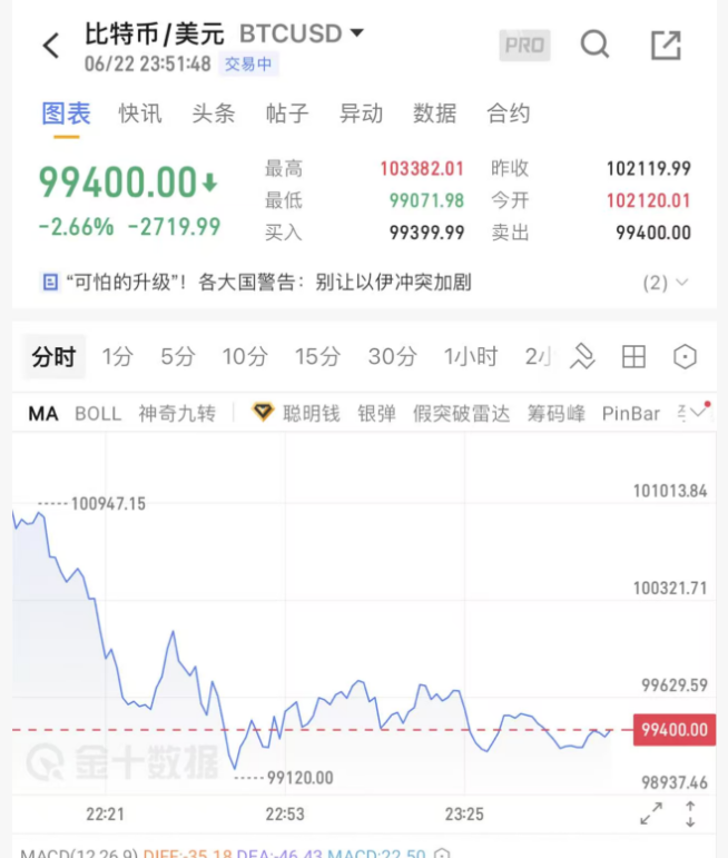 美国下场轰炸了伊朗的核设施之后,全球投资者高度紧张,担心接下来会发生一连串的连锁反应。甚至可能引发更广泛的中东战争。 比特币跳水,跌破10万美元大关 6月22日晚间,比特币跌破100000美元,跌幅在3% ...