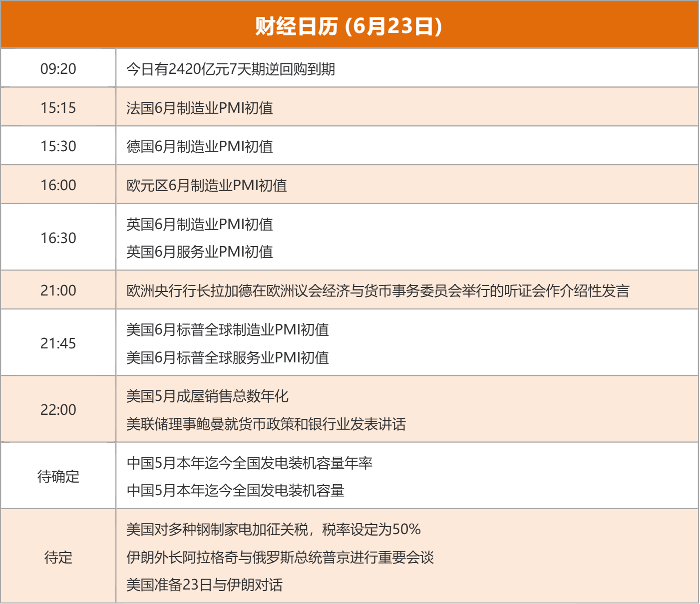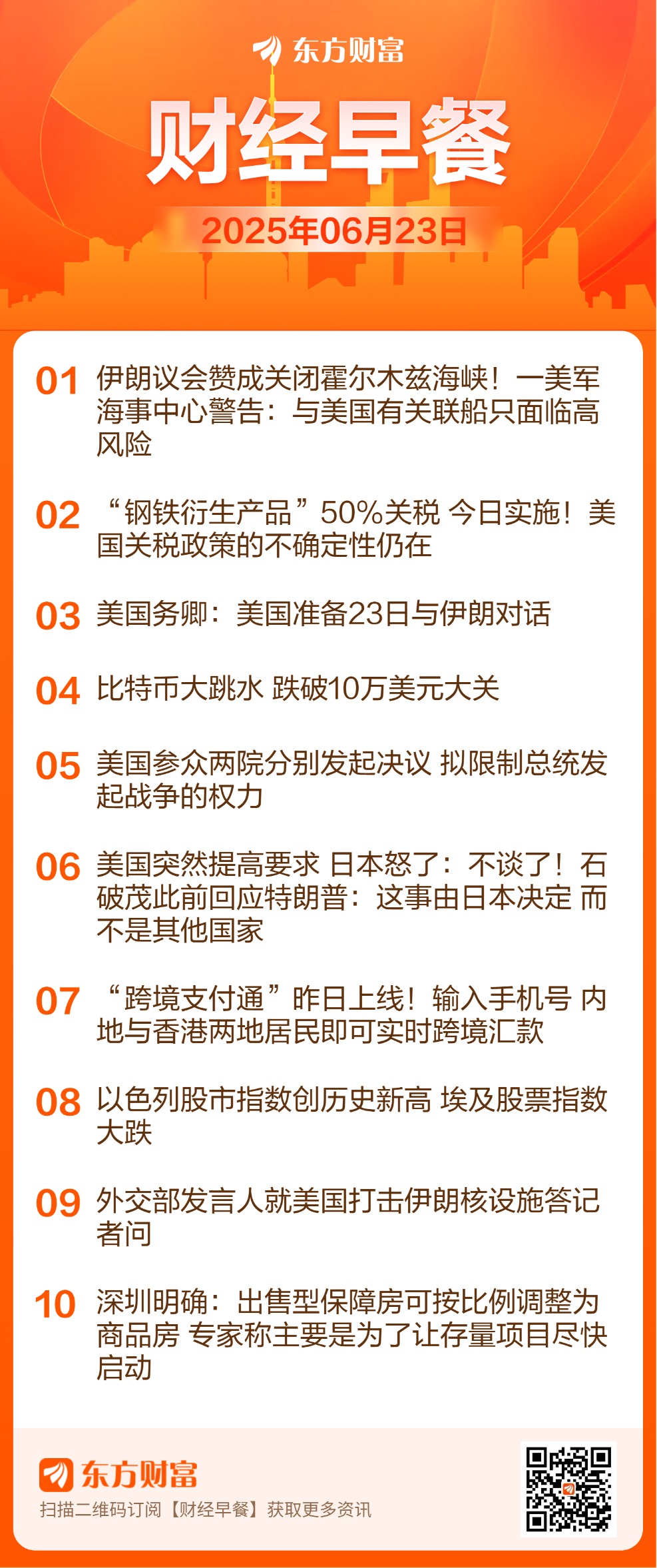 ![]() 每日精选跨境支付通: 中国人民银行与香港金融管理局联合举办内地与香港快速支付系统互联互通启动仪式。跨境支付通于2025年6月22日上线运行。跨境支付通的推出,有利于提升两地跨境支付效率和服务水平,便利两地经贸活动和人员往来,巩固和提升香港国际金融中心地位。 据了解,首批参与跨境支付通的内地机构包括,工商银行、农业银行、中国银行、建设银行、交通银行、招商银行;香港机构包括,中银香港、东亚银行、建银亚洲、恒生银行、汇丰银行、工银亚洲,后续将逐步扩大参与范围。 关税: 美国商务部此前宣布,将自6月23日起对多种钢制家用电器加征关税,包括洗碗机、洗衣机和冰箱等“钢铁衍生产品”。据美国商务部工业与安全局(BIS)发布的通知,此次关税调整将八大类家用电器及相关产品新增为“钢铁衍生产品”,统一适用50%的税率。 医疗器械: 国家药监局审议通过《关于优化全生命周期监管支持高端医疗器械创新发展的举措》,支持高端医疗器械创新发展。《举措》包括十方面具体措施。它的出台对支持高端医疗器械重大创新,促进更多新技术、新材料、新工艺和新方法应用于医疗健康领域。 欧盟委员会决定限制中企参与价值超500万欧元的医疗器械招标,欧盟委员会表示,这是对中国对在华欧企采取限制性措施的回应。对此,外交部发言人表示,希望欧方恪守市场开放承诺和世贸组织规则,为中国企业提供公平、透明、非歧视的营商环境,推动中欧经贸关系健康稳定发展。中方将坚决维护中国企业的正当合法权益。 公共预算收入: 财政部公布数据显示,1—5月,全国一般公共预算收入96623亿元,同比下降0.3%。主要税收收入项目中,印花税1787亿元,同比增长18.8%。其中,证券交易印花税668亿元,同比增长52.4%。 消费品“国补”: 据了解,消费品以旧换新加力扩围政策没有变化,补贴资金使用进度符合预期,第三、四季度中央资金将陆续下达。按照既定工作安排,国家发展改革委、财政部将在7月、10月分别下达第三季度和第四季度支持以旧换新的中央资金,各地也将持续做好配套资金支持。相关部门将指导地方进一步优化完善补贴发放方式,确保政策实施更加平稳有序、资金均衡使用到年底。 跨境期货期权交易: 据中国证监会处了解,将从10月9日起允许合格境外投资者参与场内ETF期权交易,届时合格境外投资者可参与交易的境内期货期权品种总数将达到100种。中国证监会表示,近期还将发布合格境外投资者制度优化方案,着力提升合格境外投资者制度的吸引力,持续深化资本市场高水平制度型开放。 中东局势: 美国总统特朗普21日在社交媒体上说,美军已“成功打击”伊朗三处核设施。“我们非常成功地完成了对伊朗三处核设施的打击,包括福尔多、纳坦兹和伊斯法罕。所有(美军)飞机目前都已在伊朗领空之外。”特朗普在社交媒体上写道,“满载的炸弹投向首要设施——福尔多。所有飞机正在安全返航路上。” 据央视新闻,美国国务卿鲁比奥当地时间22日在接受美国媒体采访时呼吁美国和伊朗进行直接谈判,并表示美国准备23日与伊朗对话。鲁比奥重申,伊朗可以拥有民用核计划,但不能进行铀浓缩。鲁比奥表示,伊朗拒绝了美国的提议,并在美国对其发动军事行动前消失了10天,尽管伊朗持续向对话者发送信息,但伊朗甚至不直接与美国交谈。 据央视新闻,美国参众两院分别发起决议,拟限制总统发起战争的权力。当地时间6月22日,美国共和党众议员托马斯·马西(Thomas Massie)和民主党众议员罗·卡纳(Ro Khanna)共同发起了一项战争权力决议,旨在控制行政部门并重申国会的权威。马西表示,美国没有面临迫在眉睫的威胁,发生这一切的时候国会正在休假,议员们没有得到简报。此外,弗吉尼亚州民主党参议员蒂姆·凯恩22日在接受美国福克斯新闻网的采访时表示,参议院少数党领袖查克·舒默正在推动尽快就一项限制总统战争权力的决议进行投票,以便参议院所有议员都必须宣布美国是否应该与伊朗开战。据报道,预计参议员将于24日听取有关伊朗局势的简报。 比特币: 6月22日晚间,比特币跌破100000美元,跌幅在3%左右。 热点题材 航运: 据央视新闻报道,伊朗议会国家安全委员会委员库萨里表示,伊朗议会已得出结论,认为应关闭霍尔木兹海峡,但最终决定权在伊朗最高国家安全委员会手中。霍尔木兹海峡位于阿曼和伊朗之间,连接了东部的阿曼湾和西部的波斯湾,是海湾地区石油输往世界各地的唯一海上通道,全球约三分之一的海运原油贸易都要途经霍尔木兹海峡。 白酒: 新华社发表评论指出,整治违规吃喝不是一阵风不能一刀切。文章指出,从中央到地方的各项“禁酒令”,其核心始终是规范公务行为、严明纪律红线,而非一刀切阻绝正常人际交往。党员干部有正常私人交往的权利,前提是要守住“不影响公务”“不影响廉洁”的底线。此前,人民网发表评论指出,禁止违规吃喝,不是吃喝都违规。求是网亦发表评论称,禁违规吃喝,不是禁正常餐饮。 固态电池: 近期,固态电池催化不断。产业层面,资料显示,五场大会密集召开。一是,6月19日,中国国际固态电池科技大会;二是,硫化锂与硫化物固态电池技术大会将于6月24日—25日召开;三是,固态电池大会暨硅基负极产创大会将于7月3日召开;四是,2025电解液创新发展论坛暨固态电池研讨会将于7月9日召开;五