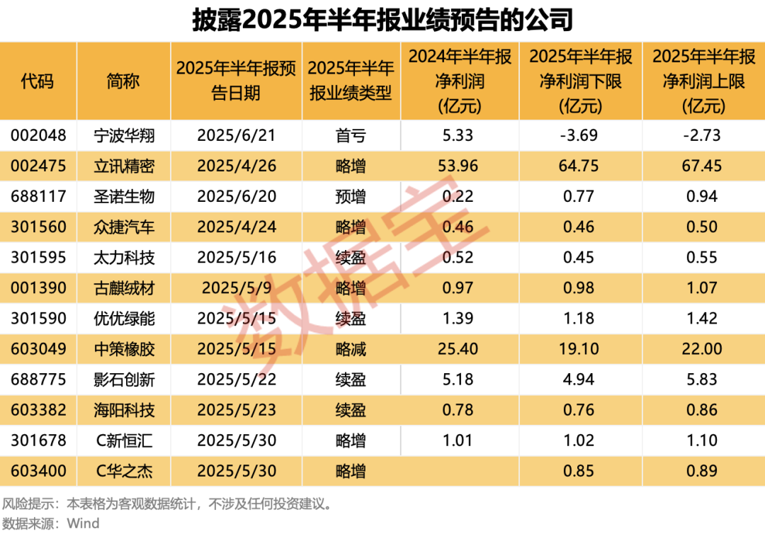 已有部分公司率先披露半年度业绩预告。 10余家公司披露半年报预告 据证券时报·数据宝统计,截至6月22日,A股市场有12家公司披露半年报预告(不含业绩类型为“不确定”公司)。 这12家公司中,有9家公司为2025年以来上市的新股或次新股,其余3家公司分别为立讯精密、圣诺生物、宁波华翔。 立讯精密预告2025年上半年净利润增幅为20%至25%。公司表示,将充分发挥越南、马来西亚、印尼、泰国、墨西哥、罗马尼亚等海外生产基地的区位优势,更灵活配合客户市场需求提供全球化制造服务,通过智能制造升级与底层能力创新双轮驱动,全面提升全产业链成本管控效能,同时加速更多元化业务的战略拓展,为全体股东创造更大价值。 圣诺生物(688117)于6月19日晚披露半年度业绩预告,2025年上半年净利润为0.77亿元至0.94亿元,净利润有望创2020年以来同期最高水平,同比增幅为253.54%至332.1%。对于业绩的增长,公司表示紧跟多肽行业发展趋势,持续拓展国内外营销市场,加大产品销售力度。2025年上半年,公司多肽原料药业务表现较好,使得业绩同比实现较大增长,净利润同比显著提升。 受业绩大增影响,圣诺生物在6月20日股价大涨15%,涨幅位居公司所属的申万二级化学制药行业首位。 宁波华翔于6月20日晚披露半年度业绩预告,预计2025年上半年净利润亏损2.73亿元至3.69亿元,上年同期净利润超过5亿元。公司表示,业绩亏损主要系2025年上半年因欧洲业务剥离对公司一次性影响约8.98亿元,属于非经常性损益事项。 ![]() (文章来源:证券时报网) |
