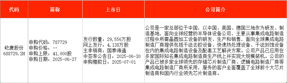 本周新股申购迎来具有全球知名度的国内集成电路龙头企业。 澎湃新闻根据公开信息梳理统计,本周(6月23日至6月27日)有1只新股安排申购,为北京屹唐半导体科技股份有限公司(下称“屹唐股份”,688729)。 屹唐股份是具备全球知名度的集成电路前道工艺设备制造商,于2016年收购美国知名半导体设备企业MTI。公司干法去胶设备及快速热处理设备已实现大规模装机,干法刻蚀设备已应用在多家国际知名集成电路制造商生产线上,服务的客户全面覆盖全球前十大芯片制造商和国内行业领先芯片制造商。 ![]() 一、本周新股申购 从时间表看,屹唐股份(688729)将在周五(6月27日)申购。 ![]() 据华金证券研报,屹唐股份是具备全球知名度的集成电路前道工艺设备制造商,在干法去胶、热处理、干法刻蚀等细分领域占据较高市场份额。据招股书显示,公司成立近10年,于2016年收购美国知名半导体设备企业MTI;MTI成立于1988年、聚焦在价值量占比近八成的前道芯片制造工序,曾先后突破半导体领域干法去胶设备、快速热处理设备以及干法刻蚀设备。 凭借此次收购整合,屹唐股份拥有了MTI较为完整知识产权及成熟产品线。此外,公司还在MTI原有的美国、德国两大研发制造基地的基础上建设了中国研发制造总部,进而构建全球化经营版图。经过多年发展,公司干法去胶设备及快速热处理设备已实现大规模装机,干法刻蚀设备已应用在多家国际知名集成电路制造商生产线上。 截至2024年末,屹唐股份产品全球累计装机数量已超过4800台,服务的客户全面覆盖全球前十大芯片制造商和国内行业领先芯片制造商。根据Gartner2023年统计数据,公司干法去胶设备、快速热处理设备分别凭借34.60%、13.05%的市场占有率位居全球第二,干法刻蚀设备市场占有率亦进入全球前十。 根据业务的相似性,华金证券选取中微公司、芯源微、华海清科、盛美上海、北方华创为屹唐股份的可比上市公司。从上述可比公司来看,2024年度可比公司的平均收入规模为99.36亿元、平均PE-TTM剔除异常值/算数平均)为36.70X、销售毛利率为42.73%;相较而言,公司营收规模及销售毛利率未及同业平均。 二、上周新股回报 从时间表看,本周暂无新股上市安排。上周共有2只新股上市,分别为新恒汇电子股份有限公司(下称“新恒汇”,301678)、苏州华之杰电讯股份有限公司(下称“华之杰”,603400)。 ![]() 6月20日,新恒汇在深交所正式挂牌上市,发行价为12.8元/股,截至上市首日收盘,该股报42.12元/股,涨幅为229.06%。以收盘价计算,投资者中一签浮盈为1.47万元。 6月20日,华之杰在上交所正式挂牌上市,发行价为19.88元/股,截至上市首日收盘,该股报53.87元/股,涨幅为170.98%。以收盘价计算,投资者中一签浮盈为1.70万元。 三、上周A股IPO上会 发审委审核方面,上交所、深交所、北交所上周均召开新一期上市审核委员会审议会议。其中,拟在创业板IPO的北京昊创瑞通电气设备股份有限公司(下称“昊创瑞通”),拟在北交所IPO的宁波能之光新材料科技股份有限公司(下称“能之光”)、上海巴兰仕汽车检测设备股份有限公司(下称“巴兰仕”),以及拟在上证主板IPO的上海友升铝业股份有限公司(下称“友升股份”),均成功过会。 ![]() 发审委审核方面,本周北交所将继续开审。 6月27日,北交所将审议奥美森智能装备股份有限公司(下称“奥美森”)的首发事项。奥美森是专业的智能装备制造生产商,主要从事智能生产设备及生产线的研发、设计、生产、销售。报告期内公司产品主要应用于工业产品的批量生产,下游行业包括空调制造、环保新能源及其他领域。 报告期内,公司海外销售收入整体呈增长趋势,产品已经远销至海外地区,国际知名度进一步提升。同时,经过多年设备研发的技术积累,基于公司拥有的多层面核心关键技术,公司将产品拓展至环保新能源领域。公司在环保新能源领域研发形成了单轴/双轴/四轴破碎机、垃圾衍生燃料SRF/RDF生产线成套设备。 ![]() 四、港股最新动态 数据显示, SAINT BELLA(02508.HK)、周六福(06168.HK)、颖通控股(06883)等均将于周一(6月23日)申购,泰德医药(03880.HK)、IFBH(06603.HK)、云知声(09678.HK)等则将于周一至周三(6月23日至6月25日)申购。 此外,曹操出行(02643.HK)将于本周三(6月25日)上市。 ![]() 上周,港股共有16家企业递交招股书。 其中,长春长光辰芯微电子股份有限公司、兆易创新科技集团股份有限公司、美格智能技术股份有限公司、苏州极易科技股份有限公司、深圳市兆威机电股份有限公司、滴灌通国际投资有限公司、北京宇信科技集团股份有限公司、岸迈生物科技有限公司、北京海致科技集团股份有限公司、广州视源电子科技股份有限公司、巴奴国际控股有限公司、新奥天然气股份有限公司、深圳市沃尔核材股份有限公司、Hope Sea Inc.等14家公司为首次递交。 上海卓越睿新数码科技股份有限公司、北京极智嘉科技股份有限公司等2家均为更新招股书。 富卫集团有限公司上周通过港交所聆讯。广东金晟新能源股份有限公司的申请失效。 ![]() 五、投融资大事记 1、6月16日,英矽智能(Insilico Medicine)宣布已于近期完成E轮融资全部交割,本轮募资总额约1.23亿美元。英矽智能本次E轮融资由亚洲最大的独立资产管理公司之一惠理集团旗下的私募股权基金、浦东创投和浦发集团、锡创投和宜兴国控联合领投。本轮融资还获得了逹宏