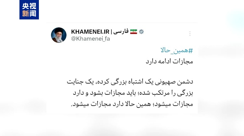 据央视新闻23日消息,当地时间23日凌晨,伊朗最高领袖哈梅内伊在社交媒体上表示,以色列犯下了巨大的错误和罪行,必须受到惩罚,且正在受到惩罚。 此前,哈梅内伊的政治顾问阿里·沙姆哈尼22日在社交媒体发文 ...