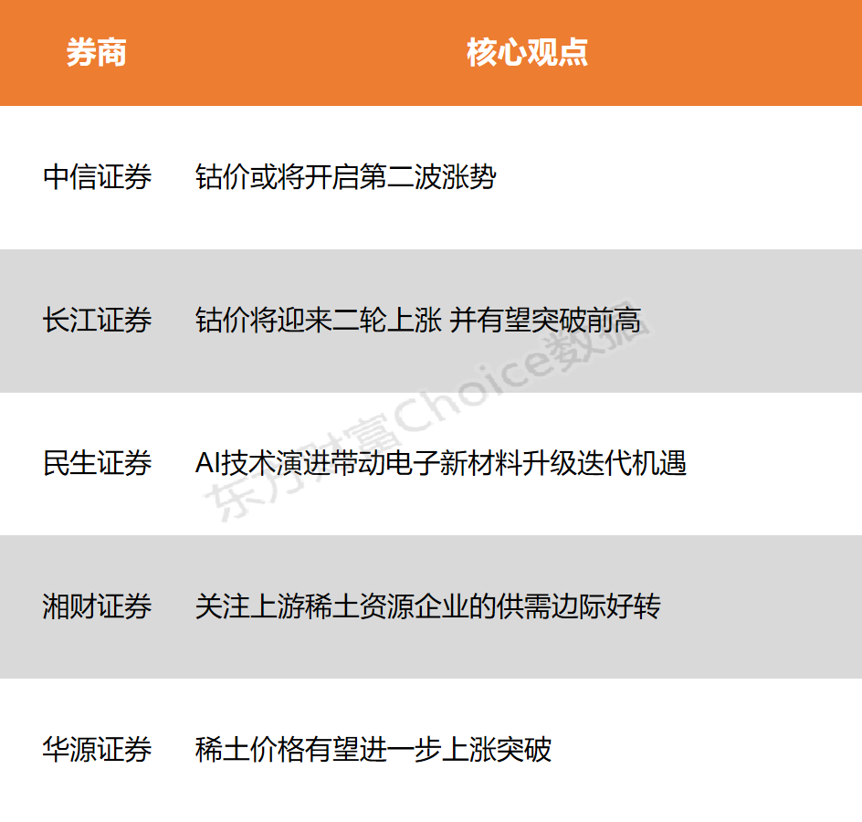 6月23日,两市股指早盘窄幅震荡,午后发力上扬,北证50指数涨超1%,场内超4400股飘红。 行业板块几乎全线上涨,能源金属、采掘行业、航运港口、软件开发、石油行业、电池、计算机设备、互联网服务板块涨幅居前,仅酿酒行业逆市下跌。 刚果(金)公布,2025年6月21日起,战略矿产市场监管局(ARECOMS)董事会采取了重大监管措施,鉴于市场上库存量持续高企,已决定将临时禁令的期限自本决定生效之日起再延长三个月,适用于刚果所有源自采矿的钴出口。长江证券表示,刚果金宣布延长钴出口禁令3个月,钴价将迎来二轮上涨,并有望突破前高;民生证券认为,AI技术演进带动电子新材料升级迭代机遇,军工需求逐步回暖军工新材料深度受益;华源证券指出,稀土价格有望进一步上涨突破。 ![]() 中信证券:钴价或将开启第二波涨势 刚果(金)政府此次宣布将钴出口临时禁令再延长三个月,这将导致6—12月份中国难以从刚果(金)进口钴湿法冶炼中间品。测算此举或影响刚果(金)2025年12.8万吨的钴出口量,或将使得2025年全球钴行业由供应过剩转为短缺7.8万吨,推动钴价开启第二波涨势。 长江证券:钴价将迎来二轮上涨 并有望突破前高 刚果金宣布延长钴出口禁令3个月,钴价将迎来二轮上涨,并有望突破前高。相较于2月底禁令发布后更多来自于情绪修复的钴价上涨,考虑到下半年将面临原料到港的真空期,且后续刚果金政策不定,本轮现货矛盾或更为突出,有部分下游冶炼厂开始出现由于原料短缺而带来的产能利用率下降。本轮钴价上行有望突破前高并看涨至30万/吨。 民生证券:AI技术演进带动电子新材料升级迭代机遇 2023年以来,国家相继针对镓、锗、锑、钨、钼、铋、铟等战略金属实施出口管制政策,国内外价格分化显著,战略属性定价不容忽视。AI技术演进带动电子新材料升级迭代机遇,军工需求逐步回暖军工新材料深度受益。 湘财证券:关注上游稀土资源企业的供需边际好转 建议关注上游稀土资源企业的供需边际好转,一方面是供给收缩预期的强化,另一方面是出口管制放松带来的需求边际增量,相关稀土资源企业有望受益稀土资源价格上涨带来的机会。中长期角度,随着稀土价格稳步回升,下游磁材企业盈利有望持续修复,建议关注下游客户结构良好,产能利用充分及未来有新增长点布局的企业。 华源证券:稀土价格有望进一步上涨突破 中国商务部宣布加快稀土出口审批流程,以缓解全球供应链紧张局势,截至目前部分企业已陆续获得出口许可证,稀土价格有望进一步上涨突破。后续可关注:1、稀土总量控制意见稿落地时间;2、稀土配额;3、缅甸稀土矿进口。稀土作为高胜率板块,中重稀土弹性更大。 (本文不构成任何投资建议,投资者据此操作,一切后果自负。市场有风险,投资需谨慎。) (文章来源:东方财富研究中心) |