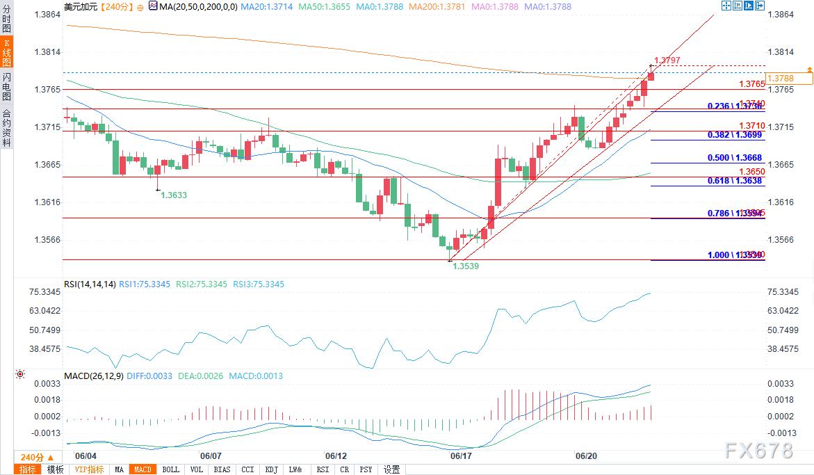 周一 6月23日 美元 加元汇价呈现先震荡整理 后大幅拉升的走势 早盘在相对窄幅区间 1 3735 1 3756附近 波动 午后开始逐步上攻 尾盘快速冲高至1 3797 突破前期震荡区间 短期多头力量主导 在上周从今年迄今低点1 35 ...