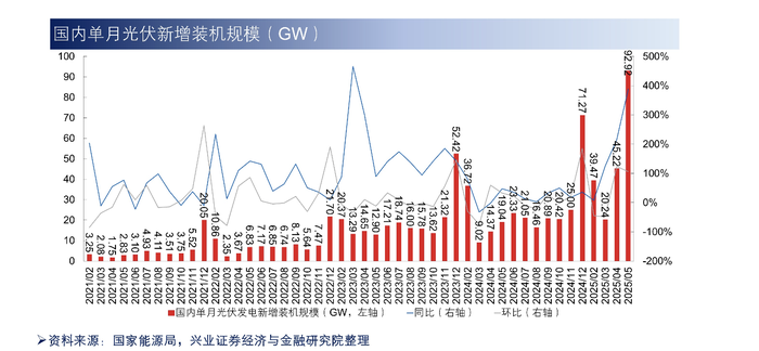 “531”节点刺激下,国内5月光伏新增装机单月干了去年三分之一的量,创下单月历史新高。 6月23日,国家能源局发布1-5月份全国电力工业统计数据,其中,太阳能发电新增装机容量1.98亿千瓦(197.85GW),同比增长约150%。去年同期,全国光伏新增装机79.15 GW,同比增长23%。 具体到单月,国内5月光伏新增装机创下历史新高,达92.92GW,同比增长388%,环比增长105.5%,环比增速较4月有所下滑。 今年4月,国内光伏新增装机量为45.22 GW,同比增长215%,环比增长123.4%。 界面新闻记者注意到,这一单月新增装机,几乎是国内去年全年装机的三分之一。2024年,中国光伏新增装机约277.2GW。 促使国内光伏新增装机爆发的原因是“531”节点。 2月9日,国家发改委与能源局联合印发《关于深化新能源上网电价市场化改革促进新能源高质量发展的通知》(下称136号文)提出,新能源项目上网电量原则上全部进入电力市场,上网电价通过市场交易形成。 136号文在明确新能源全面入市的同时,提出以2025年6月1日为节点划分存量和增量项目,即业内简称的“531”全面入市节点。因此,市场赶在5月31日前抢装,尤其是分布式光伏。 今年2月末,中国光伏行业协会曾给出今年全年光伏新增装机215-255 GW的预测,同比下滑8.13%-22.54%。以此来看,今年1-5月已经完成协会预期的78%以上。 中国光伏行业协会名誉理事长王勃华指出,2025年,受分布式光伏发电管理办法、新能源上网电价市场化改革等政策,以及这些政策与各省具体实施办法出台时间差的影响,行业存在一定观望情绪,从而增加2025年装机预期的不确定性。 ![]() 国内单月光伏新增装机规模,图片来源:兴证电新 ![]() 国内光伏发电累计装机规模,图片来源:兴证电新 近日,正泰新能源董事长陆川在接受界面新闻等媒体采访时表示,今年国内光伏新增装机肯定会下降。其预期更为悲观,预计全年新增装机在200-220GW左右。 陆川认为,从未来增量角度看,工商业、户用、集中式这三种类型的光伏项目,需求均面临萎缩风险,其中变动最大的将是集中式。因为电价等核心要素变了,很多此前已经确定的项目要重新上会、审批,但目前没有确定的电价和模型,所以没办法有进展。相较于集中式光伏,分布式光伏自发自用,项目周期较短,非技术成本占比较低,其恢复速度会更快。 上海有色网(SMM)认为,二季度末期的光伏抢装,一定程度上较大消耗了下半年的市场需求,下半年需求侧带来的整体压力将较大。SMM预计,2025年三季度市场月度装机量最低点将重新回到10 GW区间,且对于年末装机高点预期较低。 也因为光伏项目的不确定性,国内很多集中式新能源开发项目开始转为风电。 另据国家能源局数据,1-5月,国内风电新增装机达46.28 GW,同比增幅约134%。 截至5月底,全国累计发电装机容量36.1亿千瓦,同比增长18.8%。 其中,太阳能发电装机容量10.8亿千瓦,同比增长56.9%;风电装机容量5.7亿千瓦,同比增长23.1%。 1-5月份,全国发电设备累计平均利用1249小时,比上年同期降低132小时;全国主要发电企业电源工程完成投资2578亿元,同比增长0.4%;电网工程完成投资2040亿元,同比增长19.8%。 ![]() 2025年1-5月份全国电力工业统计数据,图片来源:国家能源局 (文章来源:界面新闻) |