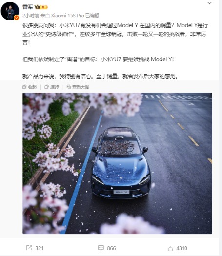 小米YU7发布前夕,雷军连续发布微博。 雷军最新发文宣布YU7销量目标。 雷军称,很多朋友问我:小米YU7有没有机会超过Model Y在国内的销量?Model Y是行业公认的“史诗级神作”,连续多年全球销冠,击败一轮又一轮的挑战者,非常厉害!但我们依然制定了“离谱”的目标:小米YU7要继续挑战Model Y!就产品力来说,我特别有信心。至于销量,就看发布后大家的感觉。 ![]() 6月23日,小米集团创始人、董事长兼CEO雷军在微博发文称,小米的首款SUV——小米YU7将于6月26日晚7点正式发布,同场发布的新品还有小折叠手机Xiaomi Flip2、搭载玄戒O1旗舰芯片的小米平板7S Pro,以及一款“面向下一个时代的个人智能设备”等。 雷军表示,小米YU7产品力非常强,很多强大的配置都是“全系标配”。 雷军称,小米YU7全系标配超长续航。标准版CLTC续航高达835km,中大型纯电SUV续航第一。 据此前数据,小米YU7长宽高分别为4999/1996/1608(1600)mm,轴距达到3000mm,是一款中大型SUV。该车搭载小米摩德纳平台技术架构,正面有效吸能空间659mm,配备20合1一体化压铸铝三角梁、三段式大压铸后地板,电池底部配备防弹涂层。 对于大家关注的价格,雷军曾表示:“19万9不可能”。 (文章来源:证券时报网) |