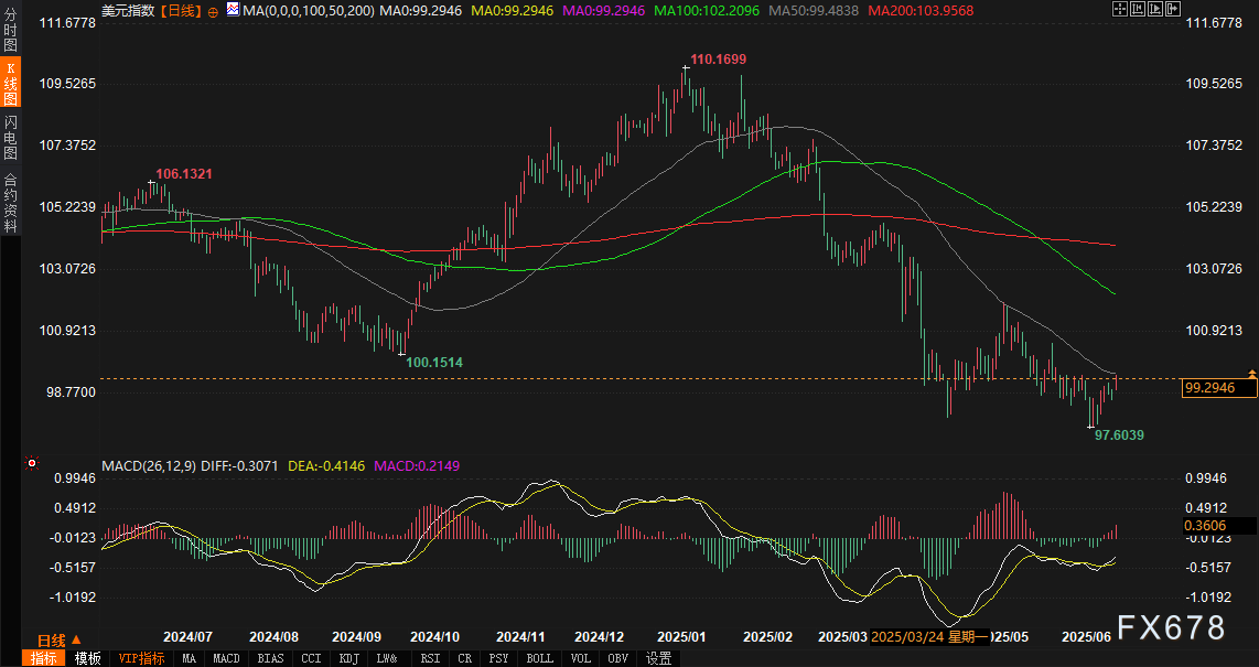 周一 6月23日 美元指数延续反弹 技术面显示 价格仍承压于50日均线 99 5557 下方 但MACD指标自6月18日DIFF上穿DEA线后 短期动能有所改善 市场情绪受双重因素驱动 一方面 美国对伊朗核设施的军事打击引发避险需求 另 ...
