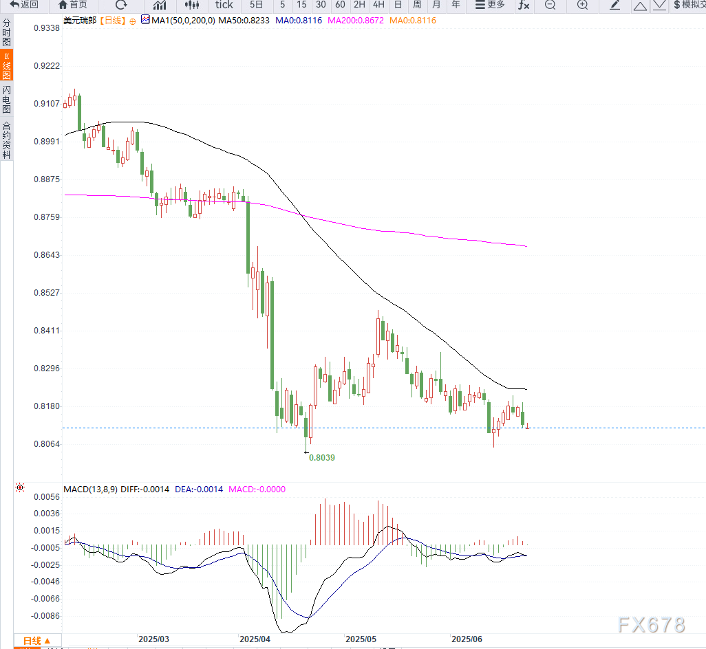 美元兑瑞郎 USD CHF 连续第二日承压 于周二亚市跌至0 8100关口附近 为逾一周最低水平 美联储政策预期发生转向 以及中东局势趋缓 均削弱了美元作为全球储备货币的吸引力 市场对美联储7月降息预期升温 是美元近期走软 ...