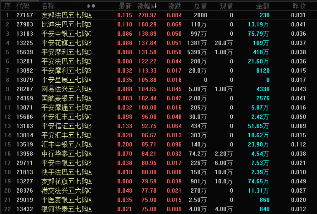 涨疯了! 今天,中国平安的认购证全线暴涨。平安中银五七购C大涨138%,平安花旗、平安法巴、平安摩利、平安摩通都一度实现了单日翻倍。平安星展、平安信证、平安汇丰、平安中银等一度涨幅都在80%以上。 值 ...