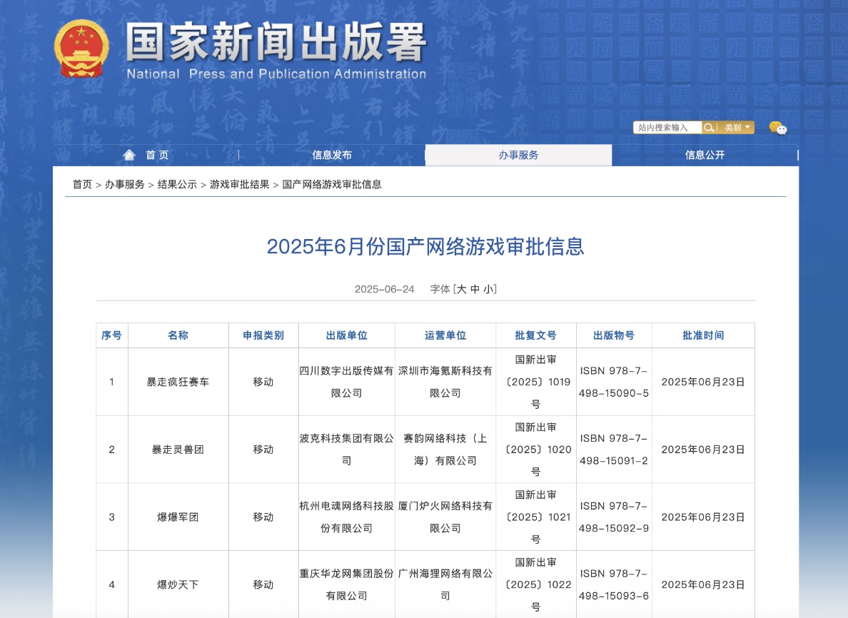 6月24日晚,国家新闻出版署发布了6月份的国产和进口网络游戏审批信息。本次国产版号数量为147个,进口网络游戏版号有11款,本批次版号数量创近几年新高。 ![]() 具体到公司,包括腾讯、网易、巨人、4399、冰川等上市公司获得版号,除此之外还有莉莉丝、波克科技等重点初创企业。重点游戏包括腾讯的《穿越火线:虹》和网易的《无主星渊》,都是进口版号。 2025年已经过半,统计这半年,国产游戏版号的数量已经来到757个,几乎每月的过审数量都在上升,5月130款版号已经是近年的新高,本月再次创下新高。除了国产版号之外,进口游戏版号审批也在加快,从去年的每两月一发,逐渐变成今年的一月一发。 2024年全年,国家新闻出版总署共下发新游戏版号数为1416个,其中,国产游戏版号1306个,进口游戏版号110个,回到了2020年的版号发放量水平。按照今年的发放趋势,游戏版号数量或许会进一步增长,有望接近甚至超过2019年的数量。 从产业报告来看,近一年游戏市场有明显的回暖,伽马数据在6月20日发布了《2025年5月中国游戏产业月度报告》,显示5月中国游戏市场规模为280.5亿元,同比增长近9.9%,中国自主研发游戏海外市场实际销售收入为15.8亿美元,同比增长6.9%。 回望2025年一季度,中国国内游戏市场规模和出海市场均同比增长近18%,中国游戏市场规模达到857亿元,中国自主研发游戏海外市场收入为48亿美元(约为人民币344亿元)。腾讯旗下的《王者荣耀》《穿越火线-枪战王者》季度流水创历史新高;此外《地下城与勇士:起源》以及世纪华通旗下点点互动的《无尽冬日》等去年同期未上线的产品也为游戏市场的增长做出贡献。 今年以来,游戏版号发放数量不断创新高,游戏审批速度也有所加快,对厂商新品的推出是很好的支持,但版号发放步入常态化后,当下游戏市场的竞争也较为激烈,在量的基础上,想要成功,“质”也越来越重要,市场期待新的爆款游戏。 (文章来源:第一财经) |