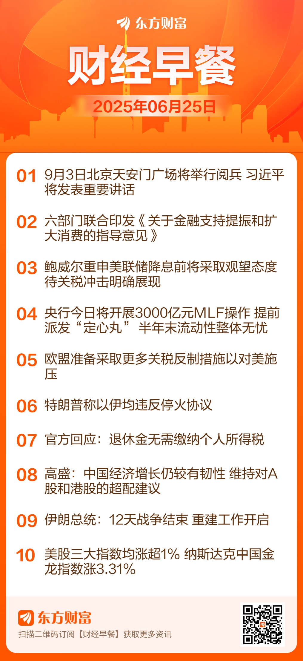 ![]() 每日精选抗战80周年阅兵: 9月3日上午,北京天安门广场将举行纪念中国人民抗日战争暨世界反法西斯战争胜利80周年大会,包括检阅部队。中共中央总书记、国家主席、中央军委主席习近平将出席纪念中国人民抗日战争暨世界反法西斯战争胜利80周年大会并发表重要讲话。 全国政协会议: 政协第十四届全国委员会常务委员会第十二次会议24日下午举行全体会议,14位全国政协常委围绕“进一步深化经济体制改革,推进中国式现代化”作大会发言。中共中央政治局常委、全国政协主席王沪宁出席。 提振消费: 六部门联合印发《关于金融支持提振和扩大消费的指导意见》。《意见》强调,要聚焦消费重点领域加大金融支持,结合消费场景和特点创新金融产品,持续推动消费领域金融服务提质增效。优化消费支付服务,健全消费领域信用体系建设,加强金融消费权益保护。 六部门联合印发《关于金融支持提振和扩大消费的指导意见》。其中提出,强化结构性货币政策工具激励。设立服务消费与养老再贷款,额度5000亿元,对21家全国性金融机构以及5家属于系统重要性金融机构的城市商业银行发放的服务消费重点领域贷款,可按照贷款本金的100%申请再贷款。 六部门联合印发《关于金融支持提振和扩大消费的指导意见》,夯实宏观经济基础,稳定消费预期。健全投资和融资相协调的资本市场功能,推动中长期资金入市,促进资本市场稳定发展。 中国央行超额续作MLF: 中国人民银行发布2025年6月中期借贷便利招标公告称,为保持银行体系流动性充裕,2025年6月25日(周三),中国人民银行将以固定数量、利率招标、多重价位中标方式开展3000亿元MLF操作,期限为1年期。鉴于6月有1820亿元1年期MLF到期,央行自3月起将连续4个月超额续作MLF。 美联储: 美东时间6月24日上午10时,美联储主席鲍威尔在众议院金融服务委员会发表半年度货币政策报告证词。美联储主席鲍威尔表示,如果劳动力市场疲软,通胀率下降,可能意味着提早降息。鲍威尔表示,由于关税的影响,预计美国通货膨胀将会上升。美联储的职责是使通胀得到控制。利率的变化将取决于经济的走向。绝大多数政策制定者认为今年晚些时候降息是合适的。 高盛唱多A股: 媒体见面会上,高盛中国股票策略分析师付思表示,市场配置方面,维持对A股和港股的超配建议,预计沪深300目标点位为4600点,MSCI China目标点位为84点,隐含约10%的上行空间。行业配置方面,高盛近期调高了银行和地产板块的评级,主要受益于国内政策支持,同时继续超配以消费为主的板块,包括医疗器械、消费服务、传媒和电商零售等细分领域。 中东局势: 美国总统特朗普当地时间24日称,以色列和伊朗均违反停火协议。特朗普说,他对以伊两国都不满,尤其是对以色列。他还表示,伊朗的核能力已不复存在。 当地时间24日,以色列国防部长卡茨表示,他已指示以色列国防军“对伊朗违反停火协议的行为作出有力回应,对德黑兰市中心的目标进行猛烈打击”。伊朗否认在停火后对以色列发射导弹。 美国总统特朗普宣布以色列和伊朗已经同意停火。对此,外交部发言人表示,中方高度关注中东局势发展,不希望紧张局势轮番升级,希望停火能够尽早实现。事实证明军事手段带不来和平,对话谈判才是解决问题的正道。中方呼吁有关当事方早日重返政治解决的正确轨道。中方愿同国际社会一道,为维护中东地区和平稳定作出努力。 当地时间24日,美国总统特朗普表示,俄罗斯总统普京向他致电并提出帮助解决伊朗问题。俄罗斯方面对此暂无回应。 6月24日,中共中央政治局委员、外交部长王毅同伊朗外长阿拉格齐通电话。王毅说,中方支持伊方致力于维护国家的主权和安全,在此基础上实现真正停火,让人民恢复正常生活,推动中东局势尽快降温。 伊朗总统佩泽希齐扬24日在致伊朗人民的公开信中表示,经过伊朗人民英勇抵抗,这场由以色列挑起、持续12天的战争宣告结束。同时,他要求各机构从即日起把精力投入到重建工作中。 热点题材以旧换新: 商务部办公厅发布关于组织开展2025年千县万镇新能源汽车消费季活动的通知。活动内容中提到,统筹汽车以旧换新、汽车流通消费改革试点等重点工作和“购在中国”系列活动安排,充分发挥地方、行业协会、企业等作用,坚持“政策+活动”双轮驱动,加强新能源汽车供需对接、新品发布,推动完善县乡地区新能源汽车购买使用环境,助力新能源汽车下乡。 广东省印发《广东省促进经济持续向好服务做强国内大循环工作方案》,其中提及,加快推动汽车、家电、家装、电动自行车、手机数码等以旧换新,进一步优化工作流程,畅通回收渠道,加快以旧换新资金清算工作进度。按照国家部署推动以旧换新政策向服务消费领域扩围。 数据要素: 国家数据局举办“数据要素×”系列第二场新闻发布会。中国人民银行科技司副司长周祥昆介绍,中国人民银行下一步将研究制定新阶段金融科技发展规划,出台深化运用金融科技推动金融数字化智能化转型的政策文件,会同国家数据局开展“数据要素×”试点,引导金融机构在安全合规前提下,发挥金融海量数据和多元应用场景优势,增强数据基础能力和底座支撑,激活做好金融“五篇大文章”的数据引擎。 医疗器械: 欧盟委员会宣称根据《国际采购工具》,限制中国企业和产品参与欧盟医疗