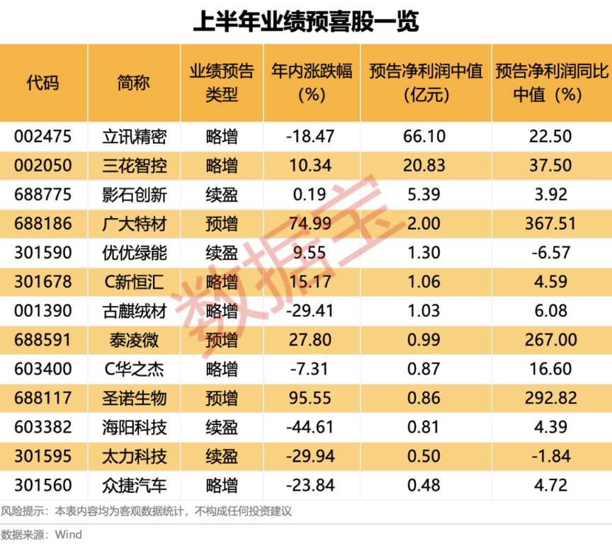 A股上市公司上半年业绩预告数据出炉。 广大特材上半年业绩大幅预增 广大特材昨日盘后公告称,预计2025年半年度实现营业收入为25亿元左右,与上年同期相比,将增加6.19亿元左右,同比增幅32.91%左右;预计归母净利润为2亿元左右,与上年同期相比,预计增加1.57亿元左右,同比增加367.51%左右。 公司表示,业绩大幅度增长主要是由于公司下游所属行业需求整体向好,公司产销两旺。此外,公司募投项目效益进一步显现,其中,风电齿轮箱零部件项目产能逐步释放,订单放量,设备平均利用率大幅度提升,销售收入同比大幅度增加,有效降低单位固定成本,实现盈利。海上风电铸件项目通过一系列技术改造、产线优化、工艺降本、产品多样化等方式促使产能利用率大幅度提升,熔炼产能满负荷运转,盈利能力增强。 广大特材年内股价表现亮眼,累计上涨74.99%。截至6月10日,公司股东户数为9809户,较5月末下降1.89%。 13只A股上半年业绩预喜 据证券时报·数据宝统计,除广大特材之外,昨日晚间还有泰凌微、三花智控发布了上半年业绩预告数据。截至目前,A股中有19家上市公司已经发布了上半年业绩预告相关信息,其中13股业绩预喜(包含预增、略增、续盈,扭亏)。 按照预告净利润中值来看,立讯精密、三花智控、中策橡胶、影石创新、广大特材等7股的净利润规模居前,均超1亿元。 立讯精密的净利润暂为最高,公司预计略增,预测净利润约64.75亿元—67.45亿元,同比增长约20%—25%。 三花智控的净利润次之,公司预计略增,预测净利润约18.93亿元—22.72亿元,同比增长约为25%—50%。公司上半年业绩预增一方面是公司在制冷空调电器零部件业务方面凭借龙头地位,受益于市场需求增长,叠加核心产品领先的技术积淀与规模效应,业务实现快速增长。另一方面,公司作为全球领先的新能源汽车热管理企业,通过标杆客户的示范效应持续拓展订单,进一步夯实业绩增长动能。 从净利润预增幅度中值来看,广大特材的净利润同比增幅最高。圣诺生物的净利润增幅次之,预测净利润约7702.75万元—9414.48万元,同比增长约为253.54%—332.10%。2025年上半年,公司多肽原料药业务表现较好,因此业绩同比实现较大增长,净利润同比显著提升。 此外,还有泰凌微、三花智控、立讯精密、C华之杰等上半年净利润均同比呈现增长。 从年内股价表现来看,年内累计上涨的个股有10只,其中青达环保涨幅居首,年内累计上涨100.29%。 公司表示,受益于国家新建火电投资加速及存量机组升级改造等一系列利好政策的影响下,公司交付的节能环保处理系统产品增加;同时,公司建设的胶州市李哥庄镇120MW渔光互补项目于2025年第一季度完成交付,对公司经营业绩产生积极影响。2025年1—6月公司预计实现营业收入9亿元到12.5亿元,同比增长75.12%到143.22%。 ![]() (文章来源:证券时报网) |