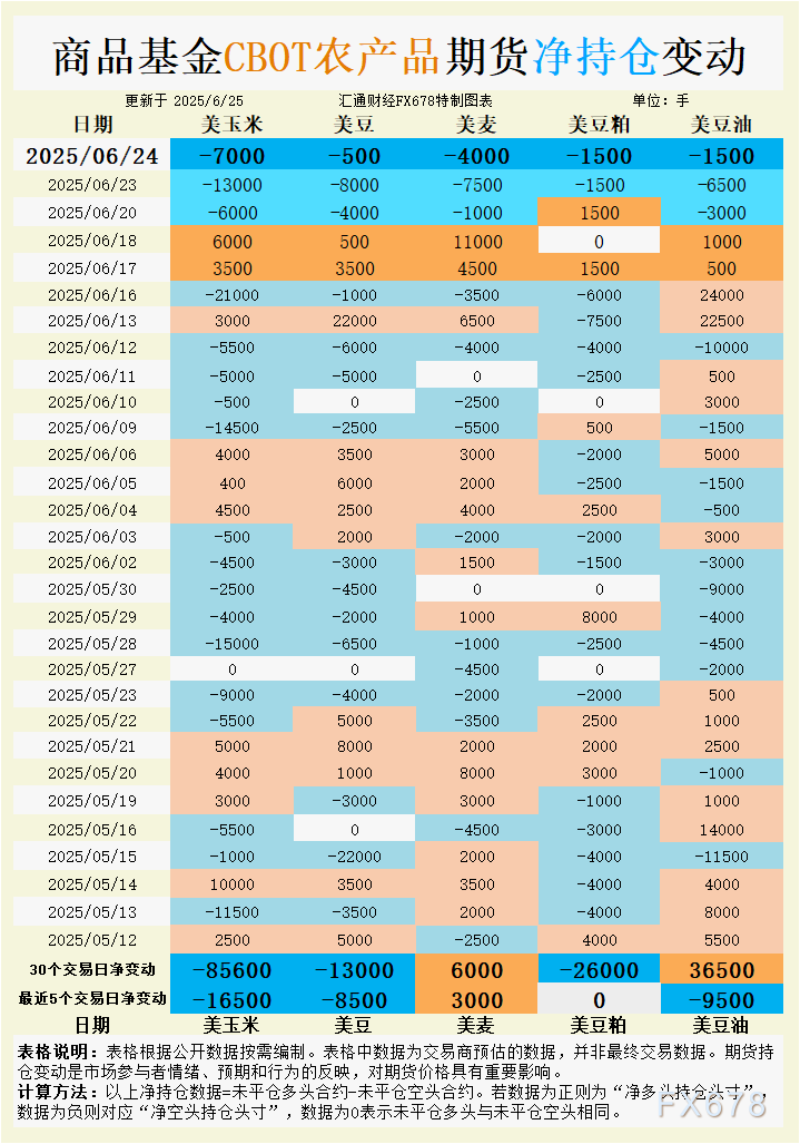 周三(6月25日),芝加哥期货交易所(CBOT)谷物期货市场在本周初延续震荡偏弱格局,受到美国中西部有利天气、南美丰产压力以及商品基金持仓调整的共同影响。北京时间6月25日,CBOT玉米、豆类和小麦期货价格普遍承压,玉米跌至7个半月低点,大豆触及三周低位,豆粕和豆油同步走弱,小麦则因空头回补略显抗跌。商品基金最新持仓数据显示,市场参与者对玉米、大豆和豆类产品看空情绪升温,而小麦持仓变动反映出谨慎乐观。 ![]() 美国中西部天气持续为玉米生长提供理想条件,6月下旬降雨充足,预计未来6-10天降水量高于正常水平,作物优良率稳定在66%左右。尽管近期美国玉米出口销售超出预期,USDA确认墨西哥采购63万吨美国玉米(2025/26及2026/27年度交割),但南美供应压力显著。巴西第二季玉米产量预计创纪录,达1.233亿吨,出口竞争力削弱美国玉米需求。CIF玉米驳船基差6月装船报价较7月期货高69美分/蒲式耳,7月装船基差持平,反映出口需求温和但受限。 商品基金在6月24日减持玉米净空头7000手,最近5个交易日净空头增仓1.65万手,30个交易日累计净空头增仓8.56万手,显示中长期看空情绪占主导。基金持续加码空头反映对巴西丰产和美国有利天气的预期,市场对玉米价格上行空间的信心不足。美国现货基差稳中偏强,农户惜售限制基差上行,但未能扭转期货市场疲软态势。 CBOT 9月玉米期货(CU25)6月24日结算价为4.12-1/4美元/蒲式耳,跌5-1/4美分/蒲式耳。短期内,玉米价格预计在4.10-4.30美元/蒲式耳区间低位震荡,出口需求提供一定底部支撑,但南美供应压力和有利天气限制反弹空间。需关注USDA周五出口销售报告及巴西产量动态。 大豆:供应宽松压制价格,空头情绪升温 美国大豆播种接近尾声,截至6月22日,种植进度达96%,优良率66%,略低于市场预期67%。中西部地区未来两周降雨和温暖天气将支持作物生长,缓解局部干热影响。巴西大豆收割结束,产量预期上调,6月出口量预计达1437万吨,全球供应充裕。CIF大豆驳船基差6月装船报价较7月期货高60美分/蒲式耳,较前日涨2美分,7月装船基差稳定在73美分,显示出口需求平稳但缺乏强劲动能。FOB出口溢价6月装船为78美分/蒲式耳,7月为74美分,反映市场对美国大豆需求的谨慎预期。 商品基金6月24日减持大豆净空头500手,但最近5个交易日净空头增仓8500手,30个交易日净空头增仓1.3万手,表明市场对大豆价格走势偏悲观。空头增仓与南美丰产及美国有利天气预期一致,基金对生物燃料政策提振需求的信心减弱。美国现货基差稳中偏强,印第安纳州加工厂基差上涨3美分,反映局部需求支撑,但未能抵消期货市场下行压力。 CBOT 11月大豆期货(SX25)6月24日结算价为10.37美元/蒲式耳,跌9-3/4美分/蒲式耳。短期内,大豆价格预计在10.30-10.60美元/蒲式耳区间整理,生物燃料需求和基差韧性提供支撑,但南美供应和天气利好限制上行空间。关注USDA出口数据及南美物流动态。 豆油:多头信心回落,价格区间震荡 豆油市场受国际油脂供应充裕和原油价格波动影响,近期走势偏弱。美国生物燃料政策预期(EPA提议2026年生物燃料混合总量为240.2亿加仑)曾提振豆油需求,但中东局势缓和导致国际油价重挫,豆油价格承压。6月22日美国大豆压榨量预计达250万吨,油厂开机率超70%,豆油供应充足。FOB豆油出口溢价保持坚挺,反映国内需求韧性,但全球植物油供应(棕榈油、菜籽油)增加限制价格上行。 商品基金6月24日减持豆油净多头1500手,最近5个交易日净多头减仓9500手,但30个交易日净多头增仓3.65万手,显示短期看涨情绪回落但中长期仍偏乐观。基金减仓反映对原油价格走弱和全球油脂供应宽松的担忧,但生物燃料需求预期仍支撑市场信心。现货基差保持稳定,出口市场对美国豆油需求提供一定支撑。 豆油期货价格短期预计在47-49美分/蒲式耳区间震荡,生物燃料政策预期提供底部支撑,但原油价格波动和全球油脂供应充裕限制上行空间。需关注USDA出口销售数据及国际油脂市场动态。 豆粕:供需博弈加剧,价格偏弱运行 国内豆粕现货价格偏弱,6月24日下跌10美元/吨,供应压力增大。巴西大豆集中到港,6月进口大豆预计超1100万吨,油厂压榨量维持250万吨高位,豆粕库存回升至40万吨,处于历史同期中等偏低水平。出口需求疲软,美国豆粕现货基差下滑,油厂挺价意愿增强,但未能扭转市场弱势。USDA预计2024/25年度豆粕出口销售15-35万吨,数据中性,未能提振市场情绪。 商品基金6月24日减持豆粕净空头1500手,最近5个交易日持仓多空平衡,但30个交易日净空头增仓2.6万手,反映市场对豆粕需求前景的谨慎态度。空头持仓增加与供应过剩和需求疲软预期一致,低库存限制价格跌幅,但未能改变市场偏弱格局。现货基差报价在部分地区持平,反映需求低迷。 CBOT 12月豆粕期货(SMZ25)6月24日结算价为295.30美元/短吨,跌1.40美元/短顿。短期内,豆粕价格预计在290-305美元/短吨区间偏弱震荡,低库存与需求疲软博弈,跌幅有限。需关注USDA出口数据及终端需求动态。 小麦:空头回补支撑价格,短期区间波动 美国硬红冬小麦(HRW)收获进度加快,中央和南部平原干旱天气支持收割推进。CBOT 9月堪萨斯HRW小麦期货(KWU25)6月24日结算价为5.49-3/4美元/蒲式耳,跌15-1/4美分/蒲式耳。蛋白溢价上涨,普通小麦铁路基差涨10美分,高蛋白小麦(11.6%)涨23美分,反映现货市场供应趋紧。国际需求方面,孟加拉国发布50万吨小麦招标(7月9日