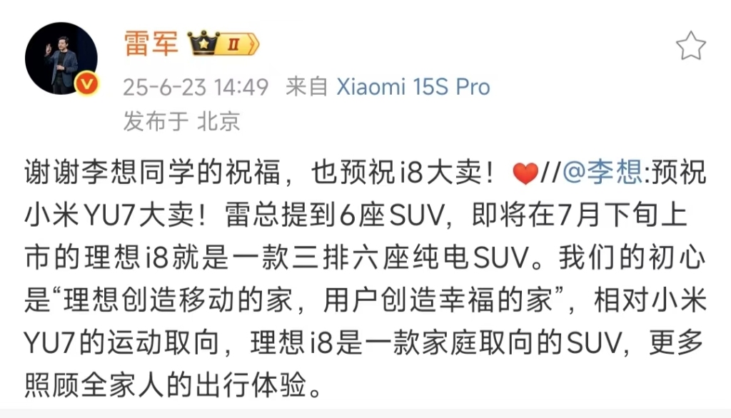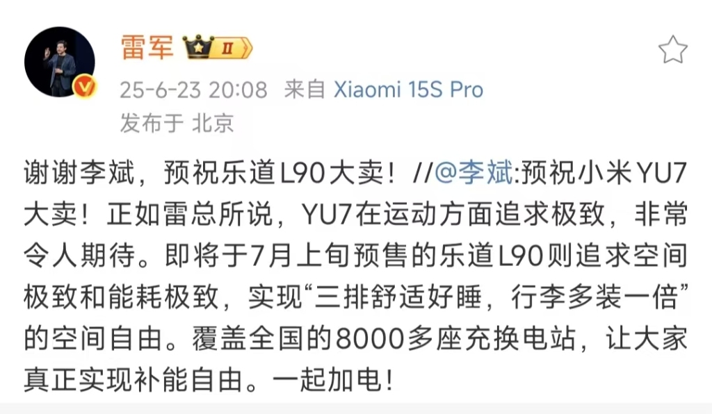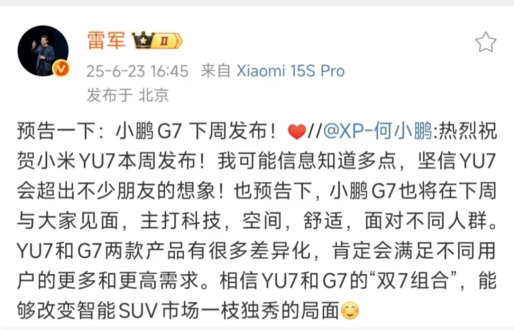 受到外界广泛关注的小米第二款车型YU7即将面世。 6月24日,小米集团创始人、董事长兼CEO雷军在微博表示,相比SU7,此次YU7上市信心更足,“上个月YU7技术发布以后,用户朋友们的热情也远超我们的预期,YU7的用户留资量是SU7同期的3倍,我预计YU7和SU7会一样火爆。” 雷军称,YU7不是拉高版的SU7,虽然两者都基于小米Modena平台开发的,但YU7项目有90%零部件都重新开发了。 根据小米的安排,YU7将在6月26日晚7点的新品发布会上正式发布。 尽管还是汽车圈的“新手”,但在雷军个人IP加持下,小米汽车可谓“流量王者”,何况SUV已是中国汽车市场竞争最激烈的细分车型,YU7显然吸引了更多关注度,蔚小理的一把手们更是在向小米祝好的同时,也顺带给自家车型打了广告。 小鹏汽车创始人何小鹏转发雷军官宣微博并表示:“我可能信息知道多点,坚信YU7会超出不少朋友的想象!也预告下,小鹏G7将在下周与大家见面,主打科技、空间、舒适,面对不同人群。相信YU7和G7的‘双7组合’,能够改变智能SUV市场一枝独秀的局面。” ![]() 对此,雷军转发微博并回应:“预告一下:小鹏G7下周发布!” 何小鹏曾经多次给雷军送上祝福。此前接受媒体采访时,他曾经透露,自己与雷军就小鹏G7和小米YU7的上市时间进行多次讨论,对小米YU7的细节非常关注,并在研发过程中提供不少建议,也从雷军那里获得许多反馈。基于这些交流与了解,何小鹏大胆预测小米YU7销量将会显著超越小米SU7。 在今年3月接受澎湃新闻记者采访时,何小鹏曾经谈到相信小米YU7一定大卖,小鹏G7肯定大卖,他希望兄弟公司、优质产品能让客户、用户和整个行业都更好。 值得注意的是,小鹏G7与小米YU7同为竞争车型,两者发布时间接近,在小米正式官宣YU7于26日发布后,小鹏在23日宣布G7的发布时间在“下周”。 蔚来董事长李斌则转发雷军微博表示:“预祝小米YU7大卖!正如雷总所说,YU7在运动方面追求极致,非常令人期待。” 另外,他还为自家的乐道L90打了波广告,据他透露,即将于7月上旬预售的乐道L90追求空间极致和能耗极致,实现“三排舒适好睡,行李多装一倍”的空间自由。覆盖全国的8000多座充换电站,让大家真正实现补能自由。 ![]() 对于李斌的祝福,雷军回复称:“谢谢李斌,预祝乐道L90大卖!” 理想汽车CEO李想也同样送上了祝福:“预祝小米YU7大卖!雷总提到6座SUV,即将在7月下旬上市的理想i8就是一款三排六座纯电SUV。我们的初心是”理想创造移动的家,用户创造幸福的家“,相对小米YU7的运动取向,理想i8是一款家庭取向的SUV,更多照顾全家人的出行体验。” ![]() 雷军转发并回复道:“谢谢李想同学的祝福,也预祝i8大卖!” 雷军造车的朋友圈阵容强大,此前在小米首款汽车SU7发布会上,李想、李斌、何小鹏均到现场助阵。在当时的发布会上,雷军坦言:“他们三位(李斌、李想、何小鹏)在过去的三年里面给我很多的建议,让我少踏很多坑,真的真心感谢了,谢谢。” 在雷军官宣造车后,一张企业家与雷军的合影曾流传网络,包括顺丰控股董事长王卫、深蓝汽车CEO邓承浩、长城汽车董事长魏建军,北京汽车集团有限公司党委书记、董事长张建勇、中国汽车工业协会副秘书长柳燕、中国电动汽车百人会副理事长兼秘书长张永伟等人均和雷军合影表达支持。 在5月底的发布会上,雷军曾经披露过YU7的配置,定位是“豪华高性能SUV”,共推出3个不同版本车型,标准版车型续航为835公里,其续航在所有中大型纯电SUV中排名第一,在四驱纯电SUV中也排名第一。值得注意的是,根据小米公布的配置,YU7全系标配非常具有竞争力:全系超长续航、全系标配小米天际屏全景显示、全系标配700TOPS 辅助驾驶算力、全系标配激光雷达、全系标配连续阻尼可变减振器。 YU7目前最大的谜底就是起售价到底多少?网友普遍希望起售价低于25万元甚至24万元,此前雷军曾在投资者大会上表态,YU7的定价不可能是网传的23.59万元,将会在正式发售2-3天前确定。 竞争对手小鹏G7的预售价为23.58万元,提供Max和Ultra两个版本。这意味着G7的实际售价还会更低。 汽车分析师、国际智能运载科技协会秘书长张翔向澎湃新闻记者分析称,YU7的价格应该会高于此前发布的SU7(起售价21.59万元),但是低于其主要竞争对手特斯拉Model Y(起售价26.35万元)。“特斯拉是知名国际品牌,而YU7目前的知名度还不够高,必须通过低价才能形成竞争,打开市场。” 此外,在发布会预告中,雷军还特别提到了一款“面向下一个时代的个人智能设备”,引发诸多猜测。据澎湃新闻记者了解,这款智能设备可能是之前预热已久的小米AI眼镜。 据外界信息披露,这是一款从功能、形态上全面对标RayBan-Meta的AI眼镜,但不同于前者的单SoC芯片方案,小米AI眼镜将采用“系统级SoC+协处理器”的双芯片方案。 AI眼镜赛道已经形成“百镜大战”,此前据外媒报道,字节跳动正计划推出AI智能眼镜,预计将在其智能眼镜中加入旗下大模型豆包的AI功能。 另一知名科技公司Rokid(杭州灵伴科技)举办Rokid Glasses产品沟通会,Rokid CEO祝铭明在会上透露,Rokid Glasses将于今年6月正式上市。过去三个月,Rokid旗下带显示的智能眼镜:Rokid Glasses,全球已交定金订单超25万台,其中在线订单超4万台,且今年内有望全部交付,同时,Rokid一次性锁定约20万台供应量,支付资金达数亿元。 小米对智能眼镜的探索已有多年,其产业链布局已经铺开。此前市场传出小米与歌