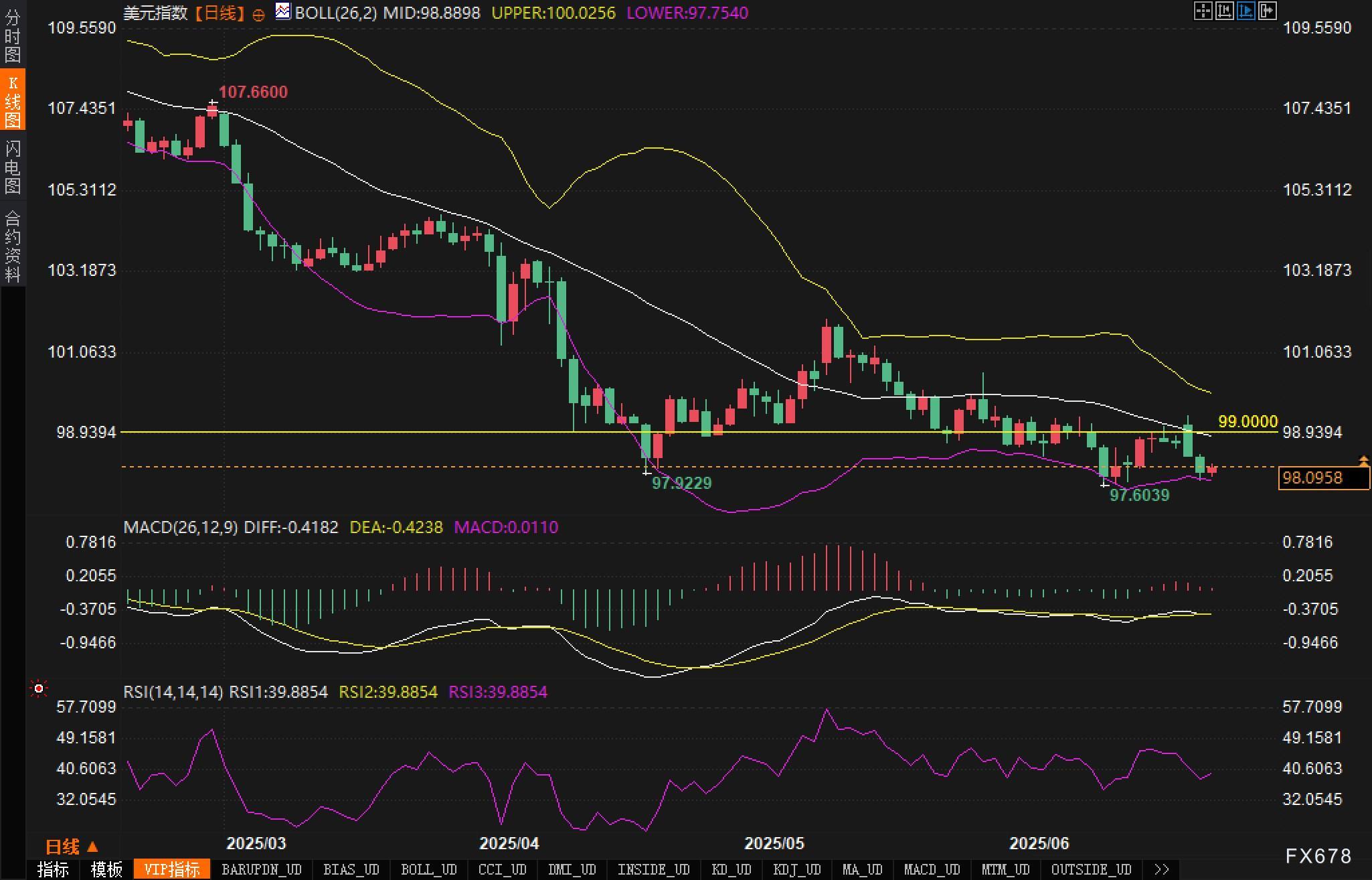 美元指数本周初连续两日下跌累计逾1.3%,周三(6月25日)则出现小幅反弹,欧洲时段交投于98.00附近,仍低于关键心理关口99.00。中东地缘局势暂时缓解及美联储官员的鸽派表态削弱了美元的吸引力。尽管主席鲍威尔重申“不急于降息”的立场,但市场已提前消化未来两次降息的预期。消费者信心数据走弱亦进一步打压美元多头情绪。 ![]() 本周以来,美国宏观数据接连不及预期,6月消费者信心意外回落,市场对美国经济动能存疑。此外,鲍威尔在国会听证中虽未明确指向7月降息,但多位联储成员如Bowman、Waller及Goolsbee相继释放鸽派信号,推动市场强化年内两次降息的预期。 中东局势虽现缓和迹象,且油价在袭击过后迅速回落,但路透报道显示美军打击并未摧毁伊朗核心核设施,地缘风险虽缓和但未解除。分析认为这为美元提供一定支撑,但不足以扭转整体空头趋势。 技术面: 从技术图形来看,美元指数处于明显的下降趋势中,自高点107.66持续下行,目前运行于布林带中轨与下轨之间,处于震荡偏空格局。 ![]() MACD指标运行于0轴下方,快慢线粘合,柱状图缩窄显示空头动能暂缓但仍未扭转;RSI指标报39.88,处于弱势区间,无明显背离,表明弱势格局延续;布林带出现收敛迹象,分析认为若后市波动扩大,需警惕趋势性选择。 市场情绪观察: 市场目前呈现温和的风险偏好回归特征;然而,交易员对美联储独立性与政策前景仍保持谨慎,尤其关注核心PCE等关键数据。 美国国债收益率小幅下行,表明市场正为降息路径重新定价,同时也折射出对经济增长放缓的担忧。分析认为美元短线情绪偏空,尽管未形成一致性杀跌动能,但对上行空间构成制约。 后市展望: 短期展望: 在地缘风险缓和与市场提前计入降息预期的背景下,美元短线或将继续承压。分析认为若98.00支撑失守,将测试前低97.60,反之若短线企稳并重新站上99.00,则有望形成短期技术性反弹。 中长期展望: 分析认为中长期走势将取决于两大变量:一是美联储的真实降息路径,二是美国经济是否陷入实质性放缓。目前市场对7月和12月降息各计入一次25个基点,若未来数据继续转弱,不排除联储提前启动宽松周期的可能,这将对美元构成系统性压力。 但若鲍威尔坚持政策独立并以数据为锚,美元或在短期调整后寻找新的支撑区间。交易员持续关注美债收益率走势与PCE数据指引。 ![]() |