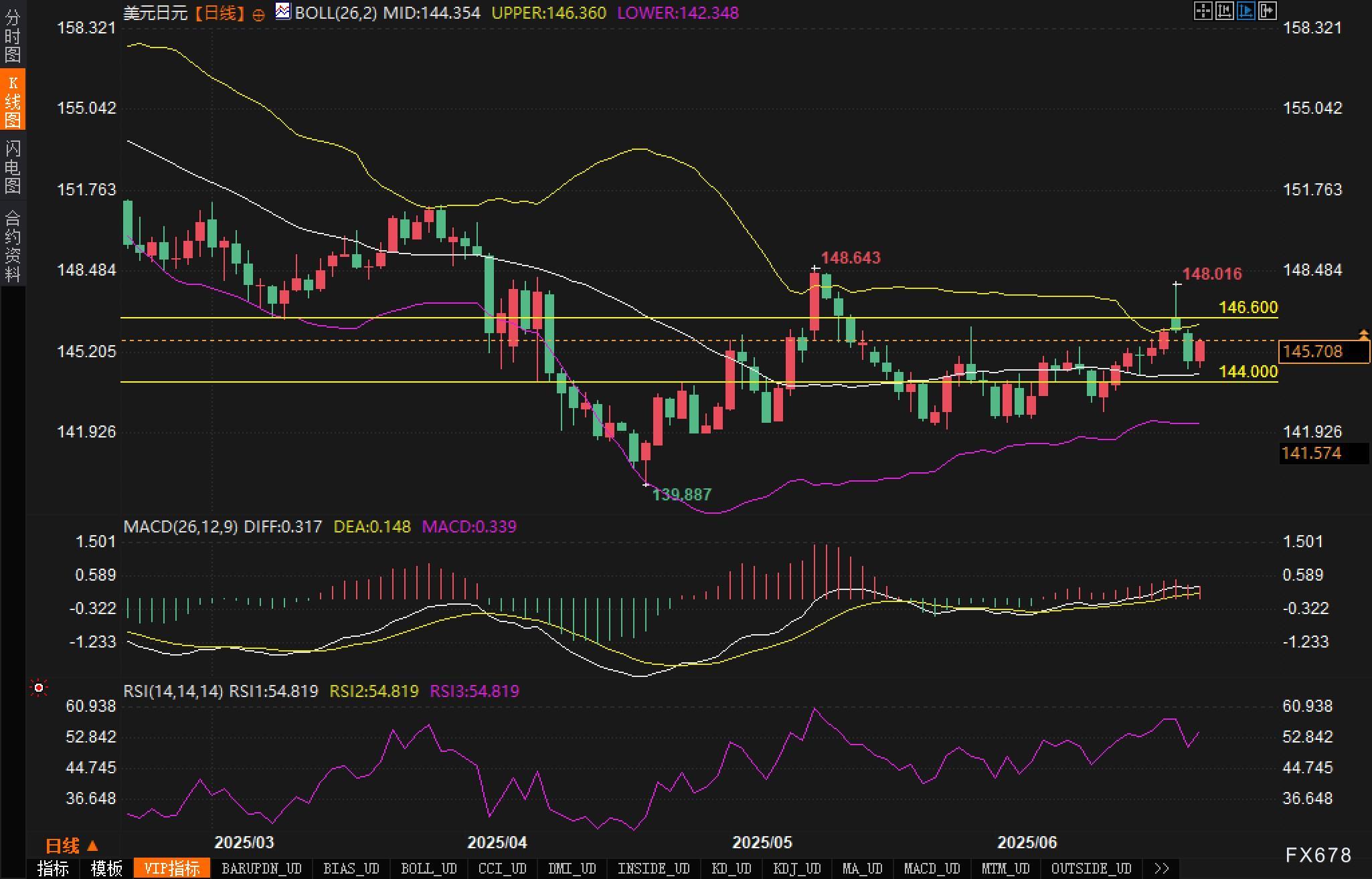 周三(6月25日),美元兑日元汇价走强,北美时段交投于145.8附近。受日本央行官员田村直树讲话影响,市场预期其加息进程可能因外部不确定性而暂缓,拖累日元在G10货币中全面走软。而美联储方面虽继续按兵不动,但疲弱的消费者信心数据强化了市场对美联储年内降息的预期。 ![]() 与此同时,美联储主席鲍威尔在国会作证时重申“保持耐心”的立场,未明确给出降息时点。然而,美国6月消费者信心指数的意外下滑使市场加大对年内两次降息的押注。美元因此整体持稳,日元则受内外夹击,成为弱势货币代表。 技术面: 美元兑日元汇价在技术图形上表现出明显的反弹趋势。当前K线位于布林带中轨上方运行,价格突破了145重要水平,逼近146区域。 ![]() 相对强弱指数(RSI)报54.82,尚未进入超买区域,暗示汇价仍有一定上行空间。 不过,分析认为当前价格距离上方148.643一线高点较近,若未能放量有效突破,可能形成双顶结构,短期面临回撤风险。 市场情绪观察: 日元的弱势表现表明,市场当前对日本央行年内加息的信心已经出现动摇。尽管日本央行纪要显示有部分委员支持继续加息,但田村直树的讲话明显反映了高层内部对当前外部风险的担忧。市场情绪转而寻求避险货币以外的套利机会,美元兑日元汇价短线受此驱动上扬。 另一方面,美联储政策路径的不确定性使得美元缺乏趋势性爆发动力。交易员对“年内两次降息”的预期虽然持续存在,但缺乏美联储明确指引,美元仍处于区间整理阶段。这种双重因素导致美元兑日元出现偏技术驱动的震荡偏强走势。 分析认为从市场结构来看,日元空头情绪升温,但市场整体对突破148.643关键阻力是否具备足够动能仍存疑虑。 后市展望: 短期展望 短线来看,分析认为若美元兑日元能够站稳146上方并持续放量上攻,则有望冲击148.643前高,进一步打开150关口空间。但若冲高回落、失守支撑位144,行情将重新转入震荡区间或技术性回调。 中期展望 中期趋势尚未明确,分析认为需观察未来一至两周内价格是否能有效突破148.643高点并维持强势。若能完成突破并构建新平台,日元可能进入新一轮贬值周期;若失败,则技术面形态将倾向“双顶”反转,回测140下方支撑的概率显著提升。 ![]() |