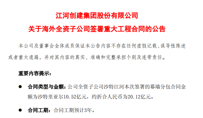 江河集团在中东地区再次斩获重大合同。 6月25日晚间,江河集团(证券代码:601886)发布公告称,其海外全资子公司江河幕墙阿拉伯工程有限公司(以下简称沙特江河)近日与SAUDI BINLADIN GROUP COMPANY LIMITE ...