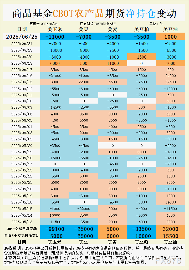 周四(6月26日),芝加哥期货交易所(CBOT)谷物期货市场延续近期弱势格局,玉米、大豆、小麦、豆粕价格普遍下挫,豆油则因生物燃料需求预期保持相对韧性。CBOT九月玉米期货(CU25)收跌7-1/4美分至4.05美元/蒲式耳,创下自2024年10月以来新低;八月大豆期货(SQ25)下跌20-3/4美分至10.29-1/2美元/蒲式耳,触及11周低点;九月小麦期货(WU25)下跌7-1/2美分至5.44-1/2美元/蒲式耳;八月豆粕期货(SMQ25)下跌4.80美元至280.00美元/短吨。美国中西部温暖湿润的天气为玉米和大豆生长提供理想条件,叠加巴西丰产预期,市场供应压力显著。 ![]() 玉米期货价格持续探底,九月合约周三收于4.05美元/蒲式耳,创合约新低。基本面来看,美国中西部温暖湿润的天气为玉米生长创造“温室效应”,作物优良率虽低于预期,但播种和出苗进度良好,缓解了市场对产量延迟的担忧。巴西第二季玉米产量预计达1.233亿吨的历史高位,进一步加剧全球供应压力。国际交易方面,美国玉米出口需求疲软,韩国近期采购的26.6万吨饲料玉米多来自南美,凸显美国玉米价格竞争力不足。USDA即将发布的出口销售数据预期显示,旧作玉米销售预计在50万至120万吨,新作销售最高35万吨,数据偏弱难以提振市场信心。 持仓数据方面,6月25日商品基金增加11000手玉米净空头,过去5个交易日净空头增仓5000手,30个交易日累计净空头增仓99100手,显示投机资金对玉米价格的看跌预期持续增强。基差方面,美国中西部河运码头(如达文波特)的玉米现货基差小幅上升,六月装船CIF驳船基差报68美分/蒲式耳(较七月期货低1美分),反映农户惜售情绪,但出口基差(FOB墨西哥湾)持平于81美分/蒲式耳,显示需求疲软限制基差上行空间。 走势展望:玉米期货短期将在4.00-4.30美元/蒲式耳区间低位震荡,供应充裕与出口疲软将继续压制价格,需关注USDA出口销售数据及南美产量兑现情况。 大豆:南美供应与关税言论施压 大豆期货价格延续跌势,八月合约周三收于10.29-1/2美元/蒲式耳,触及11周低点。美国中西部有利天气推动大豆生长,播种进度超预期,叠加巴西大豆出口强劲(6月预计出口1499万吨),全球供应宽松预期主导市场情绪。国际交易方面,中国采购偏向价格更具竞争力的南美大豆,美国大豆出口需求季节性低迷。USDA出口销售预期显示,旧作大豆销售最高60万吨,新作销售仅15万吨,数据偏弱进一步削弱市场信心。 持仓数据上,6月25日商品基金增加7000手大豆净空头,过去5个交易日净空头增仓25000手,30个交易日净空头累计增加25000手,反映投机资金对大豆价格的悲观预期。基差方面,美国中西部加工厂(如伊利诺伊州迪凯特)及河运码头(如达文波特)的大豆现货基差小幅走强,六月装船CIF驳船基差报63美分/蒲式耳(较七月期货高3美分的),FOB墨西哥湾出口溢价稳定在78美分/蒲式耳,显示美国国内需求稳定但出口竞争力不足。 走势展望:大豆期货短期将在10.00-10.60美元/蒲式耳区间盘整,南美供应压力与出口需求疲软限制反弹空间,需关注USDA出口数据及南美出口节奏。 小麦:地缘风险与空头回补支撑反弹 小麦期货表现相对抗跌,九月合约周三收于5.44-1/2美元/蒲式耳,较前日下跌7-1/2美分,但整体跌幅小于玉米和大豆。基本面来看,美国冬小麦收获因潮湿天气放缓,叠加俄乌局势不确定性及欧洲干旱担忧,触发短线空头回补。国际交易方面,孟加拉国批准采购5万吨小麦,阿尔及利亚近期采购超50万吨,显示出口需求局部回暖。然而,全球小麦供应充裕,俄罗斯2025年产量预期上调,限制价格上行空间。 持仓数据显示,6月25日商品基金增加3500手小麦净多头,过去5个交易日净多头增仓6000手,30个交易日累计净多头增加5000手,反映投机资金对小麦看涨情绪升温。基差方面,美国硬红冬小麦现货基差(如堪萨斯Wichita报-25美分/蒲式耳)保持稳定,农户因价格回升增加销售,限制基差上行。USDA出口销售预期显示2025/26年度小麦出口净销售30-60万吨,数据表现或对短期走势产生影响。 走势展望:小麦期货短期将在5.40-5.70美元/蒲式耳区间震荡,地缘风险与空头回补提供支撑,但全球供应充裕限制上行空间,需关注USDA出口数据及俄乌局势动态。 豆粕:供应压力与需求疲软博弈 豆粕期货价格承压,八月合约周三收于280.00美元/短吨,下跌4.80美元。基本面方面,美国中西部油厂压榨量高企,6月上旬豆粕库存回升至40万吨,处于历史同期中等偏低水平,短期供应压力加大。巴西大豆集中到港进一步压低国内豆粕现货价格,终端市场按需提货,成交清淡。USDA出口销售预期显示2024/25年度豆粕出口净销售15-35万吨,数据中性,难以扭转需求疲软的局面。 持仓数据上,6月25日商品基金增加3500手豆粕净空头,过去5个交易日净空头增仓16000手,30个交易日净空头累计增加33500手,反映投机资金看空情绪占主导。基差方面,美国中西部现货基差(47.5%蛋白)持平,部分地区因压榨利润下降而挺价,限制基差下行空间。 走势展望:豆粕期货短期将在275-295美元/短吨区间偏弱震荡,低库存与需求疲软博弈,跌幅有限,需关注USDA出口数据及国内压榨节奏。 豆油:生物燃料需求提供支撑 豆油期货表现相对坚挺,价格持平得益于美国生物燃料政策预期的支撑。基本面看,美国豆油出口需求强劲,USDA数据显示截至11月底出口量创8年同期高点。全球植物油供应充裕,马来西亚棕榈油及加拿大油菜籽价格波动对豆油市场情绪形成间接影响。USDA出口销售预期显示2024/25年度