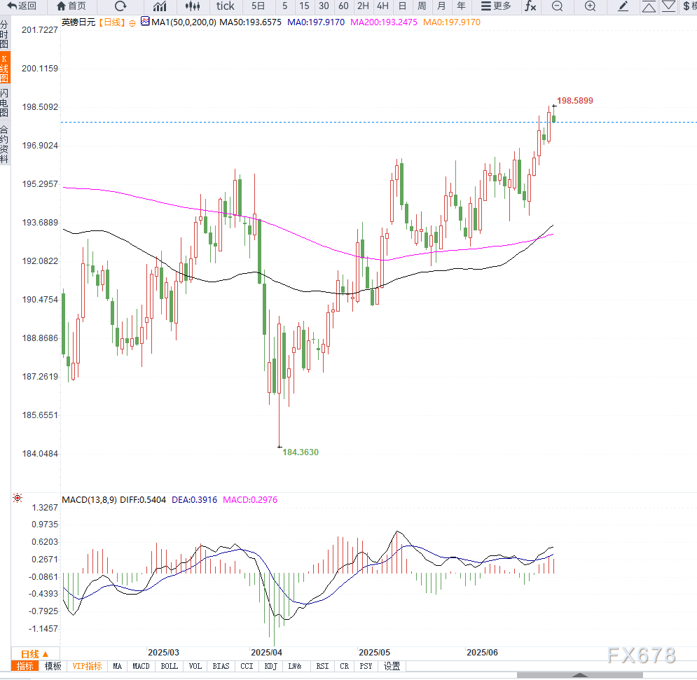 英镑因英国央行鸽派立场承压,日元保持坚挺 ![]() 虽然价格短线下跌,但从日线图来看,英镑兑日元仍运行于100日指数均线上方(目前约193.50),显示结构尚未遭到破坏。14日RSI维持在62.60的高位,反映多头动能仍占主导。 当前首个支撑位在196.17,为6月23日低点;若跌破,则下方目标分别看向194.34(6月18日低点)与193.00(布林带下轨)。更大支撑位则在100日EMA的193.50附近。 上行方面,首个阻力位为布林带上轨198.45,若能有效突破,或进一步打开上涨空间至198.95-199.00区域,为2024年12月高点及整数关口。进一步阻力位在199.81(2024年10月高点),若势头延续,或挑战200关口。 ![]() 尽管贝利的鸽派言论短线压制了英镑,但从技术面和日本央行的政策差异来看,GBP/JPY整体仍维持偏多格局。当前回调或为测试支撑的良机,若196.17支撑失守,则需要警惕进一步回撤风险; 反之,只要维持在193.50上方,价格仍有望重返199区域,甚至挑战年内高点。关注即将公布的英国就业和通胀数据,以及日本CPI结果,为后市方向提供更明确信号。 ![]() |