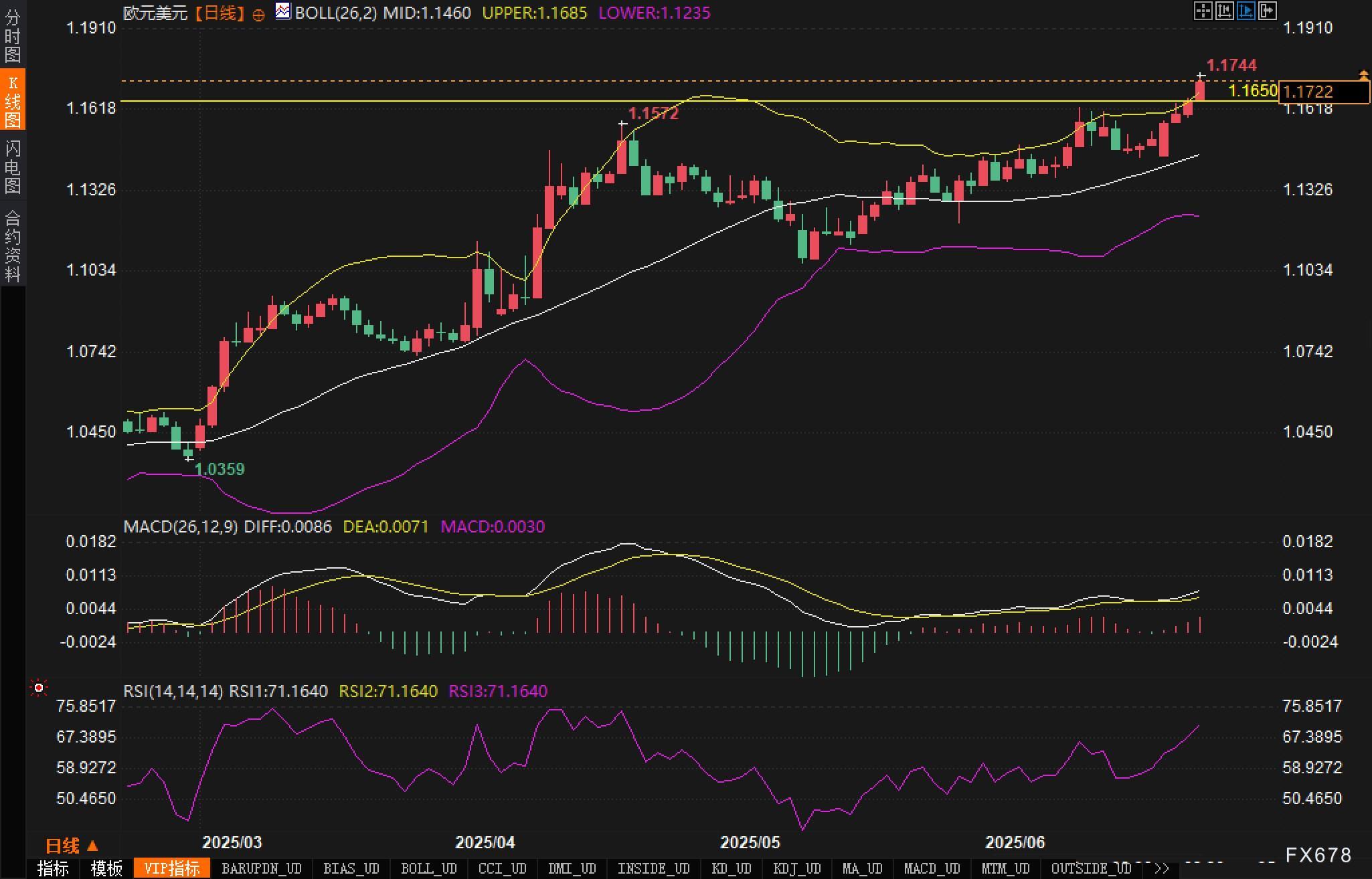 周四(6月26日),欧元兑美元持续第六日上扬,盘中触及1.1744,为2021年9月以来新高;欧洲时段汇价交投于1.172附近。近期美元大幅下挫,主要受到对美联储独立性担忧影响,而欧元受益显著。 ![]() 欧洲央行副行长德金多斯今日表示,若欧盟推进结构性改革,欧元国际角色有望进一步增强。与此同时,尽管地缘紧张局势尚未完全缓解,市场表现却异常冷静。 美国方面,焦点重回总统特朗普对美联储主席鲍威尔的公开施压。据《华尔街日报》报道,特朗普或将在9月至10月间提前公布鲍威尔的继任者名单,以削弱其影响力,相关候选人包括国家经济委员会主任哈塞特和财政部长贝森特。这一表态引发市场对美联储独立性和政策前瞻的质疑,美元指数连续回落。 此外,美国5月耐用品订单数据将在北京时间今晚公布,若超出预期,或为美元提供短暂支撑。但市场普遍保持谨慎,静待周五的PCE物价指数,这将成为判断美联储后续路径的重要依据。 技术面: 从日线图来看,欧元兑美元汇价自1.0359低点展开稳健上升趋势,当前连续突破关键阻力区域,布林带呈现典型“开口扩张”形态,显示波动率正在放大,趋势延续性强。 ![]() MACD指标上,快慢线交叉向上,红柱重新放大,动能持续增强。RSI指标处于超买区域(71.16),表明短期或有技术性回调需求,但强势结构仍未被破坏。 市场情绪观察 当前明显偏向多头市场情绪。分析认为美元的系统性弱势源于政治风险和政策不确定性,而非基本面疲弱,因此在缺乏美元强势催化的背景下,欧元得以持续获利。 尽管德国GFK消费者信心数据不及预期,显示民众储蓄意愿增强、消费意愿疲软,但该数据对汇价影响有限。反之,交易员正更多关注美联储内部博弈和政策稳定性,对美元的反向押注明显。 从资金流向看分析认为,近期欧元兑美元的上涨并未出现量能背离,资金呈现持续流入态势,进一步巩固上涨趋势基础。 后市展望 短期展望:分析认为若今晚美国数据未能显著改善市场对美元的预期,欧元兑美元有望维持强势震荡格局。关注1.1650的支撑有效性,若守稳则多头结构维持不变。 中长期展望:随着特朗普进一步打压美联储公信力,分析认为若候选人明确且偏向鸽派,市场将提前计入更宽松预期。届时欧元有望挑战1.1850甚至1.2000的中期阻力。但考虑到RSI已现超买,短期可能面临回测压力。 ![]() |