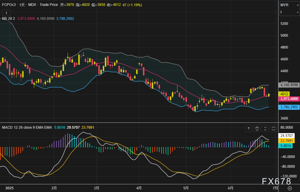 周四 6月26日 马来西亚衍生品交易所9月交割的基准棕榈油合约 FCPOc3 收报4012林吉特 吨 单日涨幅1 19 但周线终结六连阳录得2 57 回调 值得注意的是 日线布林通道 20 2 中轨3973林吉特构成日内支撑 而MAC ...