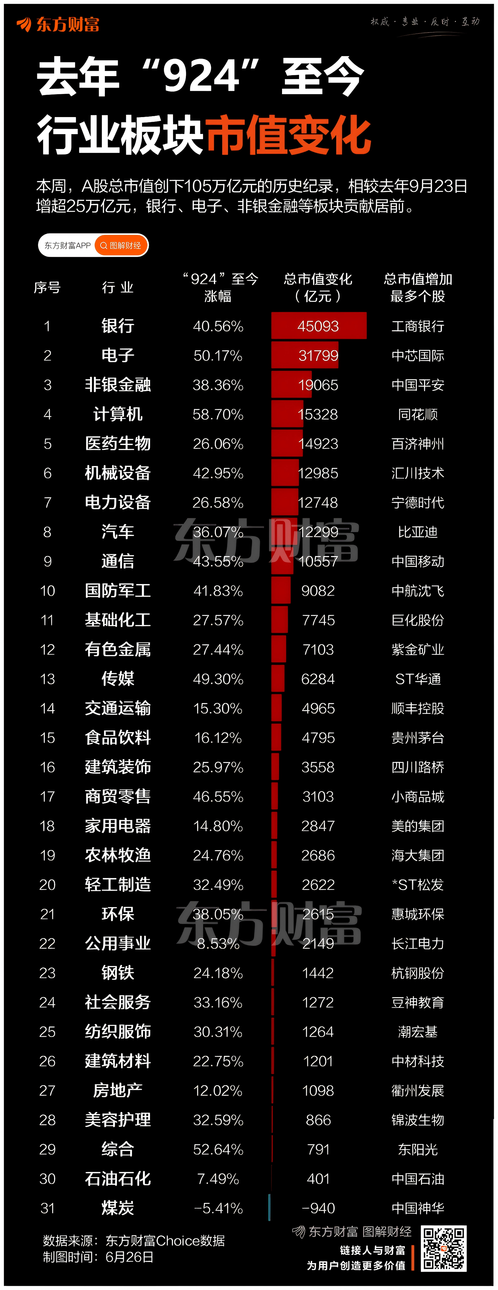 ![]() 据东方财富Choice数据,6月26日(周四),A股总市值报105.1万亿元,为连续第二日站上105万亿元整数关口。6月25日(周三),A股总市值创下了105.47万亿元的历史纪录。 自去年9月24日行情启动以来,A股总市值已增超25万亿元,银行、电子、非银金融等板块贡献居前。 具体来看,“924”至今,银行累计涨幅超40%,总市值增加了4.51万亿元,最新总市值报15.87万亿。银行股中,“宇宙行”工商银行总市值增加最多,超7100亿元。 电子累计涨幅超50%,市值增加了3.18万亿元,最新总市值报9万亿元。电子股中,中芯国际市值增加最多,超3500亿元。 非银金融累计上涨38.36%,市值增加了约1.91万亿元,最新总市值报7.54万亿元。非银金融股中,中国平安市值增加最多,超2450亿元。 (文章来源:东方财富研究中心) |