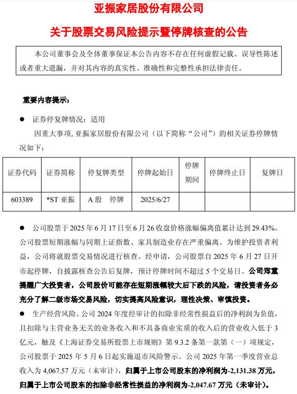 *ST亚振(603389)6月26日晚间公告,公司股票于6月17日至6月26日收盘价格涨幅偏离值累计达到29.43%。公司股票短期涨幅与同期上证指数、家具制造业存在严重偏离。为维护投资者利益,公司将就股票交易情况进行核查。 ...