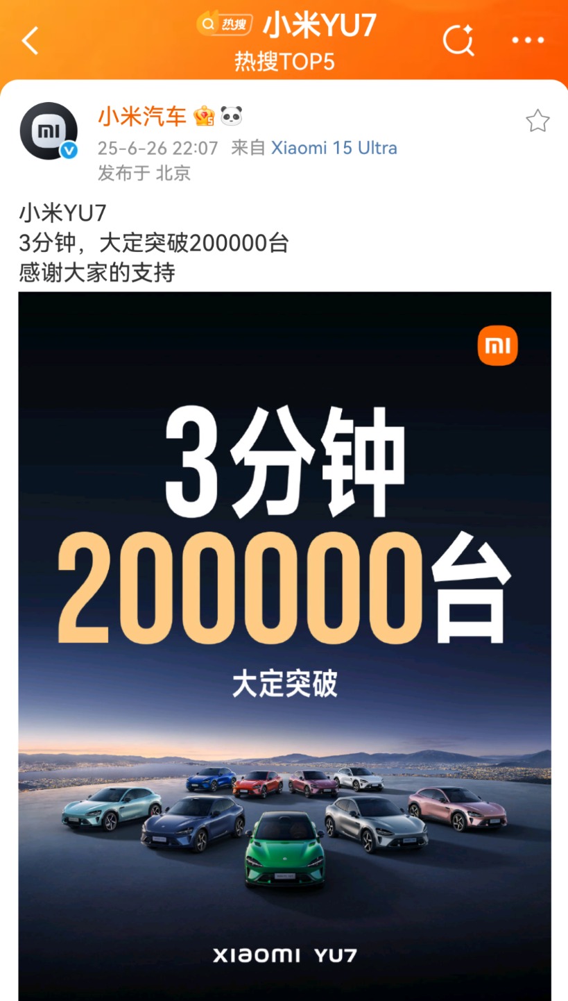 6月26日晚间,小米汽车官微发布消息称,YU7正式发布后3分钟,大定突破20万辆。 同时,词条“小米YU7价格”冲上微博热搜榜首位。 同日晚间,小米创始人、董事长兼CEO雷军在小米人车家生态发布会上宣布,小 ...